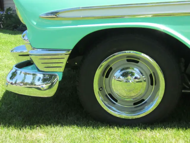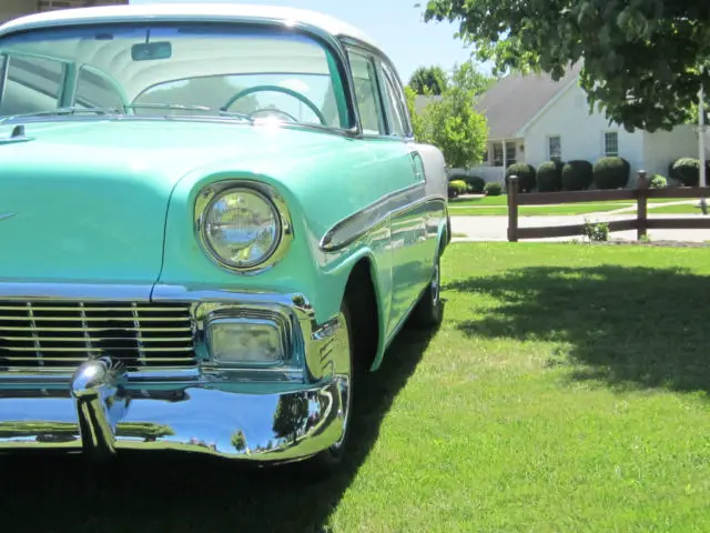 Up for sale is a beautifully restored 1956 Chevy Bel-Air 2 door sedan. This 56 went through a body on restoration in 2012. {Soda Blasted to bare metal} The car was a good car to start with minimal body work, andno floor or trunkpans have been replaced, It had factory undercoating years ago that preserved the bottom. ( Have photos of restoration before & after)The women that owned the car said it was her families car that came from New York in 56 and stayed in central Florida it'sentire life. It was originally copper and white but when restored I went with a much more appealing green color and bright white. As you can tell in the pics the body and paint are flawless as is the stainless trim, and newcustom interior. The chrome on this 56 is outstanding with the exception of the rear bumper which is original to the car. Originally equipped with a 265 V8 now has a new 350Crate engine that was factory dyno at 409 hp and freshly rebuilt TH 350 and new torque converter, new exhaustceramic coated headers, new flowmaster mufflersoriginal speedometer and lokar shift linkage that connects it to the original column mounted shifter,Front and rear stock drum brakes completely rebuilt with new lines, hoses, wheels cylinders master cylinder, ball joints, tie rods, and shocks are relatively new.All new sideglass new rubber gaskets, window tracks, channels, felt whiskers. All chrome and stainless throughout the car has been either restored or replace. New American Autowire throughout, new Retrosound radio, kick panel speakers,Dynamat sound deadener,all new door and window handles and cranks. I will stop with all the new but Iam sure there is more to list see pictures and judge for yourself. This is a very good looking car, stands out anywhereand fun to drive. Let me know if you have any questions.Thanks.