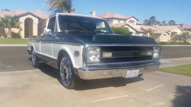 Up for sale is a 1971 Chevrolet C10 truck. This truck was originally a long bed but was made into a short bed by previous owner. The truck was painted about a month ago in a dark green and pearl white combination. The bed of the truck wassprayed with Ryno liner so you can put your things in the back with out worrying about damaging the truck. The paint in my opinion is about a8.5 out of 10, it has a nice shine and the guys at a local body shop did a good job on it. The truck has a new bumper and new grill. It also has new bottom side trim and rear tailgate trim. The rear bumper is in driver quality condition but still has a nice shine to it. All the glass is in good shape and windows roll up and down with no problem. The truck has new 18x8.5 and 20x10 ridlerwheels and also new tires. The interior of the truck is in really nice shape. It was also painted the dark green. It has new kick panels with speakers in them, new door panels, new a/c trim, new steering wheel, new gage bezel, new stereo with AUX hook up and new seat belts. The truck also has the upgraded rubber carpet flooring, the seat was re upholstered and so was the dash. The window and door cranks are also new. The stereo and speaker package workand have a decent sound, not super loud but good enough for a nice drive...Lets get into the important stuff. The truck has a 305 SBC engineand a 700r4 transmission combination. The truck has new shorty headers and flow masters. The truck sounds really good and aggressive. The truck is a turn key truck and I take it on long drives with no problem. Also living near the border I have been stuck in line to cross back to US for over a hour and had no over heating issues. This truck drives straight and was recently aligned after it was lowered using lowering spindles in the front 3 inch drop and lowering springs in the back 4 inch drop. The truck is equipped with A/C and Heater that work. YES YOU HEARD RIGHT, the A/C system was just serviced and works as it should. so if you live in the desert like me, no problem and if you are a snow bird well you can keep warm in the truckas well.The speedometer and all gauges work along with headlights and turn signals.Thewindshield wiper's also work. The horn was working a few days ago and is now not working, I think its probably just a loose wire.With this said,This is a nice looking, strong running truck that is currently driving really good. But as any true car guyknows old cars and trucks tend to need things fixed, so I cant guarantee that it will run this good for ever. So before you buy it, please come test drive it,take it to a mechanic or do anythingyou need to, truck is being soldAS-IS with no warranty. The buyer is responsible for shipping or pick up of the vehicle. Call me with any questions 760-693-9471