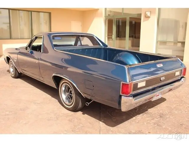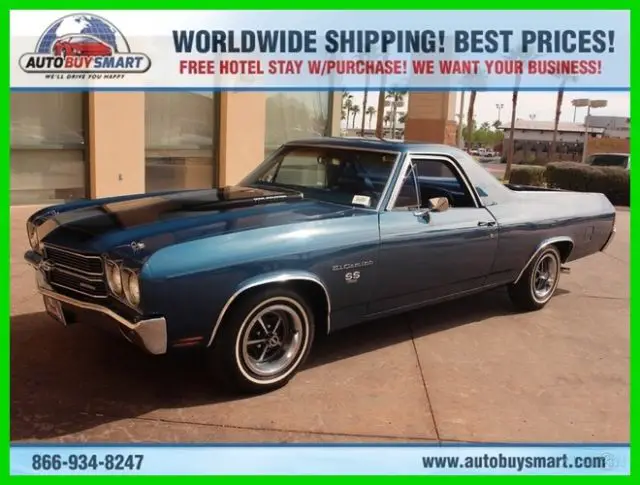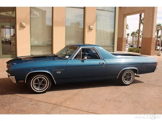 This Arlington, TX, built big block is documented with its VIN-matching Protect-O-Plate still attached to the original warranty card. This is an L34 CTW-coded 402ci Tonawanda built V8 rated at 350hp, mated to the stock strong shifting TH400. Factory 12-bolt open carrier rear end and functional cowl hood. It was also ordered with air conditioning, which is still blowing cold. This 1970 SS EL Camino wears a new coat of its original Fathom Blue paint with black Rally stripes, 2-stage base coat/clear coat. All lights and gauges function as intended. Originally shipped to Las Vegas and remained here until last year, when it moved to California for a short stint to be freshened up with new paint, suspension and interior components. This classic SS drives and handles the way it was intended to with style.