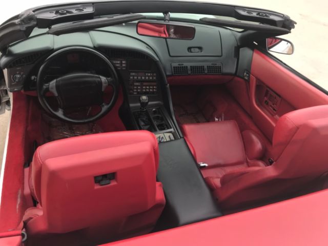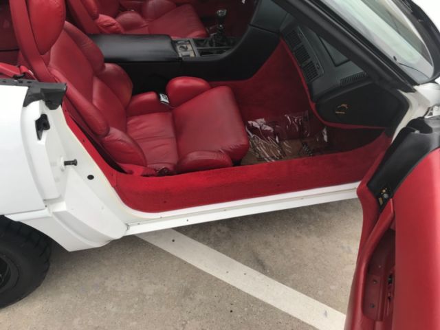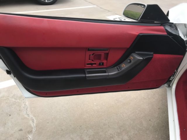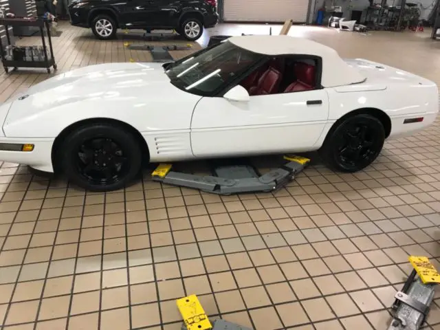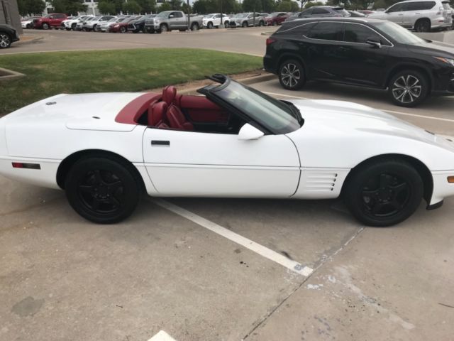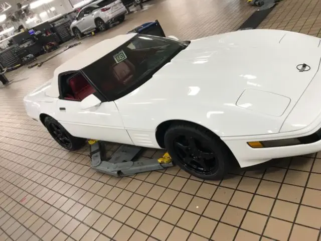 1991 Chevrolet Corvette convertible with 55647 miles. White with red leather 6spd manual transmission. Current owner is certified master mechanic. I have completely gone through vehicle and everything works but the radio and windshield sprayers. radio head unit seems to be shorted out and I have seen factory replacement ones on ebay for $300. Windshield washer doesn't work because the pump broke off the tank I also have seen replacement ones on ebay for $75. New parts include rear tires, water pump, belt, belt tensioner, battery, ignition cylinder and wheels. vehicle was just professionally detailed and fluids changed. interior and exterior are in great condition the top is faded and rear window is faded but there are no water leaks! drivers door was painted at one time and looks good the rest of the paint is original and it really shines! Ice cold air conditioning