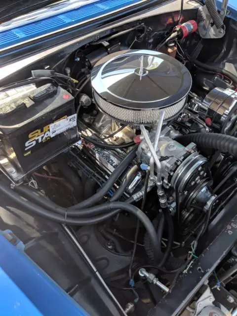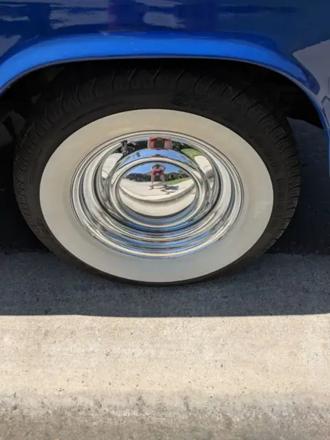 Peer inside and you'll see and interior you'll really appreciate, with lots of great details throughout. It sports the same blue and white theme as the exterior, with the same creative application. The bench seats don't appear to have seen much use at all. There's a new cloth headliner above the carpeting below. The dashboard is especially inspired, matching the same blue and white theme and sporting an effective mix of new and old technology. And aftermarket tachometer has been added, resting comfortably on a striking chrome Ididit tilt column below the fan shaped original speedometer. Just below the new ignition switch, a set of gauges stand at the ready to monitor voltage, water temp, and oil pressure. Extra care has gone into the touches that add driving comfort. The vintage Air A/C system in optimum working condition and even the sockets on the dash lights have been replaced to ensure maximim brightness. Occupying center posiiton is a period appropriate looking AM/FM/CD system, with a blue Chevy bow-tie at its center and its connected to a multi-disc CD changer in the trunk thats also lined with a new floor mat.