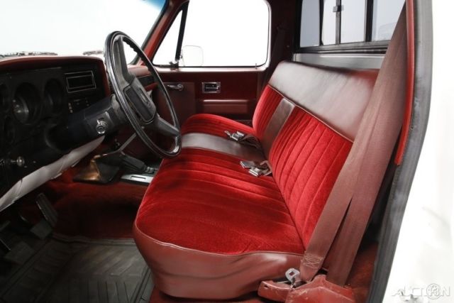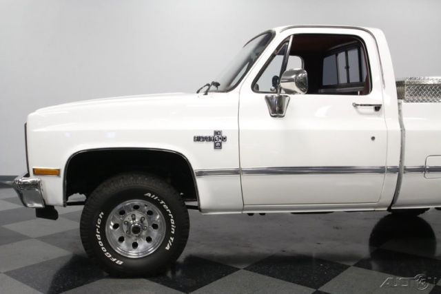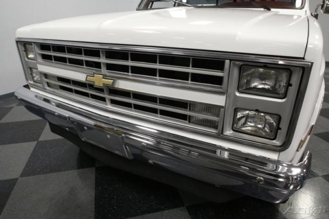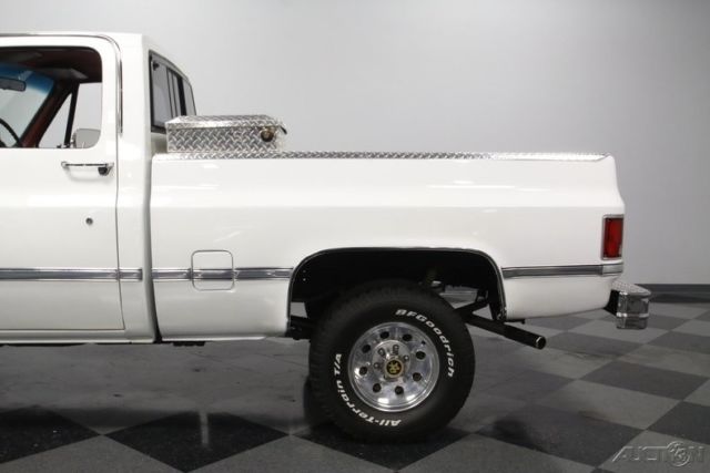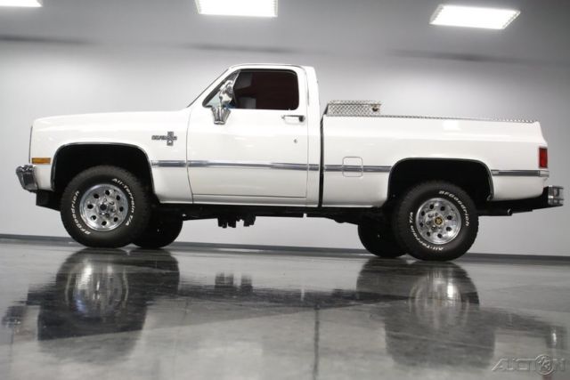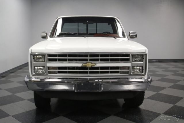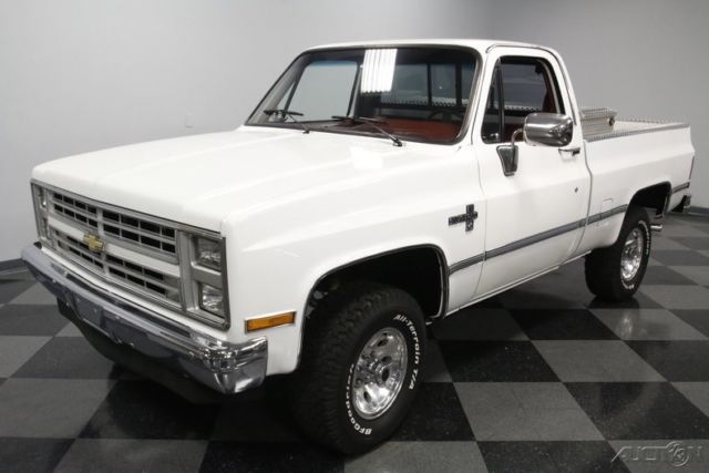 With trucks becoming more car-like every day, there's starting to be a real call for the classic real-deal pickups like this 1986 Chevrolet K-10 Silverado. This 4x4 has the great no-nonsense looks, and the investments made in this one went to enhance the robustness just as much as the beauty. The Silverado was the premium trim of the truck line, and so it looks quite nice in a bright white. This premium attitude is heightened by the big chrome bumper, wide grille with color-matched strip, and full side trim. But don't accuse this pickup of being a pretty boy. They paid special attention to make sure that the upgrades were equal parts flash and function. For example, the rear step bumper, bed side protectors, and Kobalt lockable tool box not only have mirror-like finish, but also diamond plate toughness. Plus, only the best trucks received the 15-inch factory alloys. The red interior is fantastic against the white exterior, especially because this looks like there have been given some fresh investments. It's also a nice place to spend some time thanks to the plush velour-topped seat and sliding rear window. Plus, the driver-oriented setup means a dual-spoke steering wheel that gives you a commanding view of the gauges. It's an easy reach to all your controls, including the upgraded AM/FM/CD stereo and newer Vintage Air system. You've got nice hints of shine under the hood with the bright air topper and the valve covers that announce this as a 350 cubic-inch motor. More than just look attractive, this V8 has extra substance thanks to the Edelbrock four-barrel carburetor and Weiand intake. Not only does this extra power give the dual exhaust extra growl, but you also get extra muscle for when you're enjoying this 4x4 off-road. As you look at the undercarriage photos, the cleanliness of the components tell you there have been the right investments and care so that you can rely on this pickup. This one is really built to be a good truck. The four-speed manual transmission is geared to offer plenty of low-end torque, and the BF Goodrich All-Terrain T/As are great to have when the pavement ends. Plus, power steering and front disc brakes are great anytime features no matter if you're in the high country or Main Street. This is the truck that works hard and plays hard. It gets a lot more attention than a new 4x4, and it even still comes with all the right truck features. So don't miss out, call today!