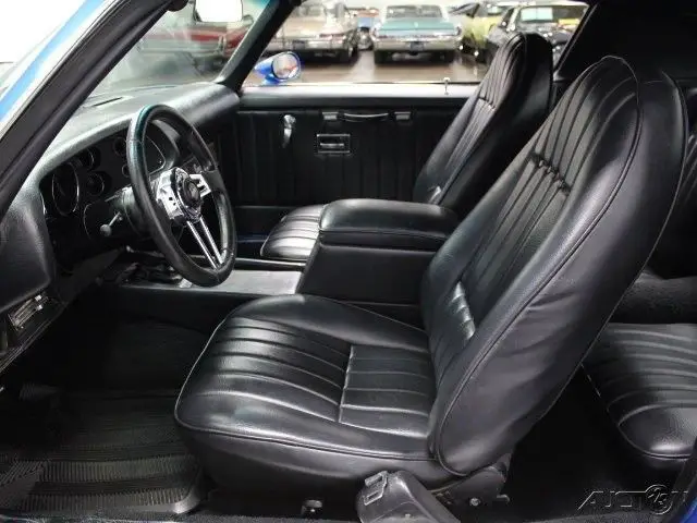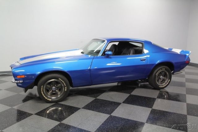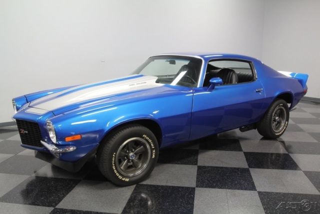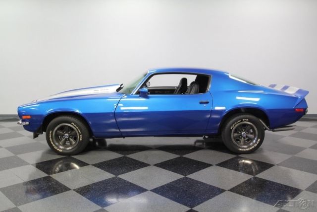 The all-new 1970 Camaro debuted with a long list of engine options, and this nicely refinished Z/28 packs a very potent big block that makes it one of the most formidable second-gen F-bodies we've seen. It's also great-looking and ready to cruise thanks to a big investment in getting the little things right. If we had to guess, we'd say that the color is pretty close to code 26 Medium Blue Metallic, and like most second-generation Camaros, it looks long, low and sleek. Silver stripes look sharp and highlight both the cowl-induction hood and 3-piece rear spoiler, and workmanship is great overall. Gaps are even, the long doors line up well, and despite the substantial upgrades under the hood, the exterior remains fairly low-key given this car's performance potential. The shine comes from modern two-stage urethane which has been buffed and polished to look spectacular and a big part of the car's aggressive look comes from the RS front grille with small bumperettes under the headlights, a popular feature then and today. Nice chrome highlights the medium blue paint without being overpowering and proper Z/28 badges were installed in all the right places. The black interior remains largely stock, with lots of new gear inside. The handsome bucket seats wear new seat covers, there are new black carpets on the floor, and the door panels look great with vertical pleats that add a kind of vintage vibe. A center console with armrest is a welcome site in any Z/28 and the Hurst T-handle shifter for the 4-speed gearbox suggests that it was built only for performance. A Grant steering wheel is a modern piece that is ergonomically worlds better than the original, yet looks right at home in the 44-year-old interior, and there's a JVC AM/FM/CD stereo head unit for entertainment. The wrap-around instrument panel is a handsome, modern-looking design that includes big, round gauges that appear to be in very good original condition and have been rigged to work with the upgraded powerplant. And please take a look in the trunk, where you'll find correct spatter-finish paint and no hidden surprises. The engine is a built 396 cubic inch V8 that wears L78 375 horsepower decals on the open-element air cleaner, but likely makes a bit more than that today. With bright Chevrolet Orange paint on the block, it has a period look, but the upgrades are obvious, from the Edelbrock Performer RPM intake manifold to the MSD ignition system. It's also dressed to impress with lots of chrome and aluminum, plus braided stainless hose covers and those handsome Performance Specialties valve covers. Key it up and it snarls to life through Hooker Super-Comp long-tube headers and Flowmaster mufflers, instantly tipping folks off that this is no garden-variety Camaro, yet it's docile enough to drive every day. The 4-speed transmission snaps through the gears, delivering twist to the 10-bolt rear end, which hangs on traction bars and air shocks to make the most of available traction. 235/60/15 BFGoodrich radials do their best and look great on factory SS wheels with charcoal centers. Look at the performance and workmanship that went into this Camaro, then take another look at the price; finding more speed in an early Camaro for less cash will a pretty big challenge. Call today!