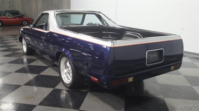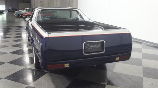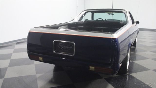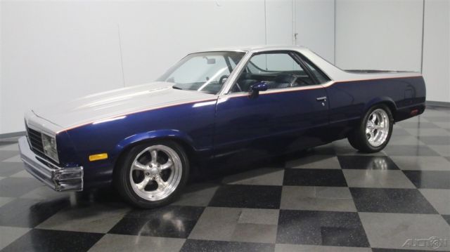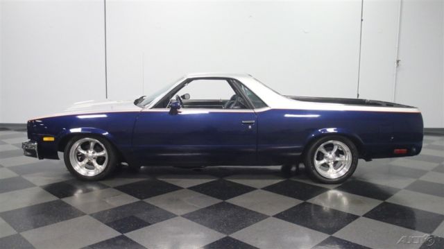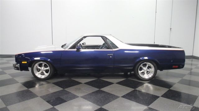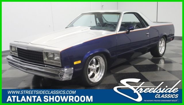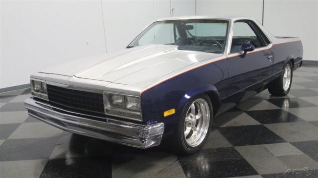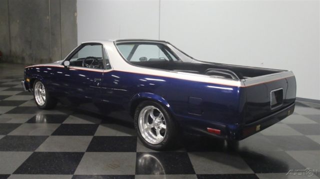 It's official, 1980s El Caminos are worthy of collector status. This 1985 Chevrolet El Camino was deemed worthy enough to have a fairly comprehensive makeover, it remains one of the nicest truck/cars we've seen in a long time. It remains affordable, but the look screams expensive! Thanks to handsome two-tone paint, this El Camino looks like you spent a fortune on the upgrade. Blue and silver are a classic combination that works particularly well on the Elky's bodywork, enhancing the length of the body and highlighting the car's unique features. Lots of time clearly went into the paint job, with bodywork that's shiny and free of ripples, and getting anything built in the mid-80s to fit together this well takes dedication and patience. Thanks to modern urethane paint and an orange pinstripe separating the colors, it looks like a million bucks and aside from some cracking on the tailgate, it remains quite nice overall. There's also a cowl induction hood and a rear roll pan to give it a bit for a custom look, and combined with the stance, it has a pro-touring look. Most of the chrome and stainless trim remains in place, although its' been de-badged, and the band of bright trim surrounding the bed remains in excellent condition. And speaking of the bed, it has a spray-in bedliner so you can still put this one to work on weekends if that's your intention. The mostly original interior is in good shape, and it includes a luxurious-looking bench seat and custom billet steering wheel. The SS instrument panel should look familiar to anyone who drove a rear-wheel-drive GM product in the '80s, but it's in remarkably good condition following the build, with a seamless dash pad and clear markings on the gauges. Blue carpets and matching door panels with neatly done speaker enclosures add to the OEM feeling inside, and you'll note that this El Camino is heavily optioned with power windows and locks, A/C, cruise control, and a tilt steering column. The original radio was yanked in favor of a modern AM/FM/CD head unit in the dash and a set of subwoofers behind the seat. You'll be pleasantly surprised by how much room there is inside and how bright and airy it feels, despite the close-coupled body and big bed out back. This is a car that you could easily drive cross-country without feeling like it beat you up. The engine is a 305 cubic inch Chevy V8 topped by an Edelbrock intake manifold and 4-barrel carburetor and augmented with dual exhaust. Most of the engine bay looks fairly stock, but there's a bit more power on tap today than back in 1985. An open-element air cleaner and finned valve covers add some interest to the all-business engine bay, which uses mostly OEM components for reliability and easy service. A 3-speed automatic overdrive transmission means this El Camino is an easy highway cruiser, and it spins the original rear end, which has highway-friendly gears inside. A custom exhaust system splits into two pipes for a great sound, and that awesome stance comes from a set of 2-inch drop spindles up front. Flashy Boyd Coddington wheels wear 245/45/17 front and 275/40/17 rear performance radials. Someone invested quite a bit of time and effort to get this El Camino looking this good, and the results are certainly worth the asking price. El Caminos remain popular year after year and this one is proof that you don't need to spend a fortune to have a cool car. Call today!