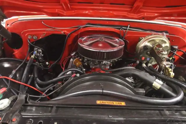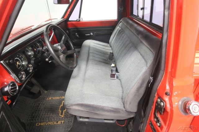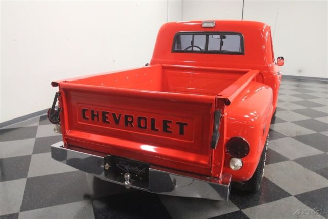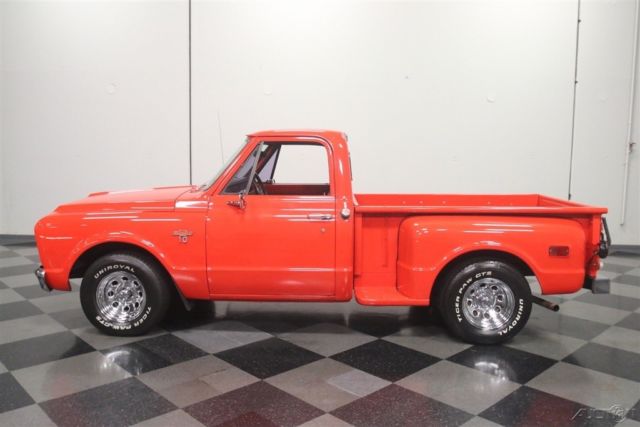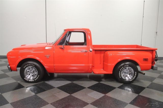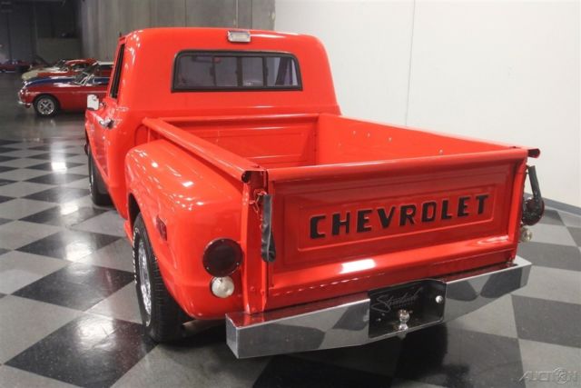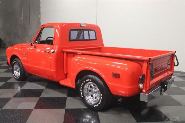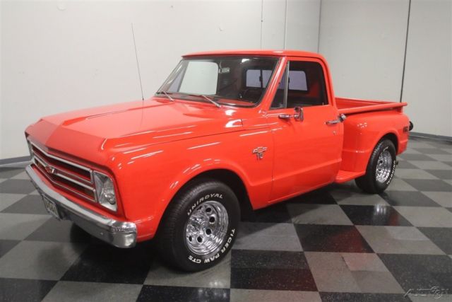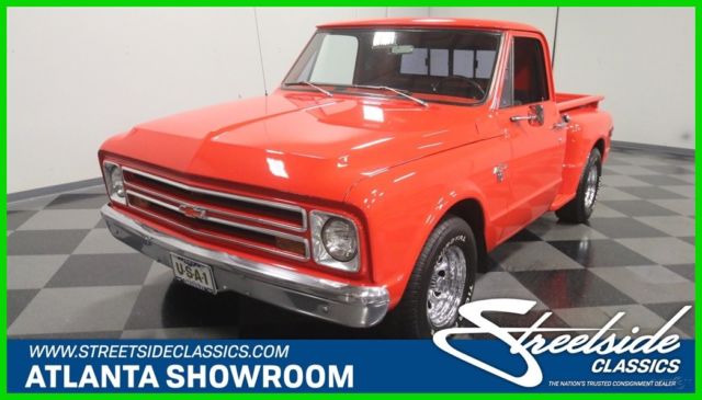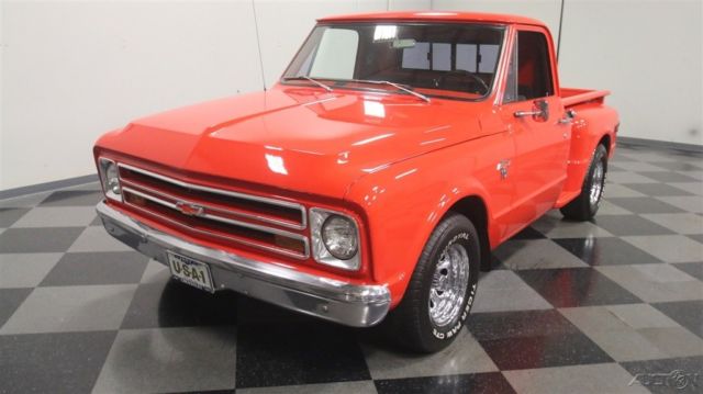 This 1967 Chevy C10 pickup neatly blurs the line between street rod and pickup truck. Lowered and wearing a well-done bright red paint job, it grabs your attention and doesn't let up until you've seen all the cool little details. If you like your hardware beautifully detailed and your look timeless, this is the truck you should be driving. Admit it, you're digging how this truck looks, aren't you? Is it the bright red paint? Maybe, but only because it makes the rest of the classic sheetmetal, including the sporty stepside bed do the talking. With the lowered stance, you can see the graceful curve that stretches from the nose to the back of the cab, and the canted front end looks fast, not utilitarian and truck-like. Finish work is quite good, with even gaps and a smooth surface for the eyeball-popping paint to cling to. The flared fenders of the stepside bed always give trucks a high-performance look, but they're also practical, leaving a bed that's devoid of fender wells. It's not so perfect that you're afraid to use it as a truck, and the bed, while wood, isn't refinished so you're afraid to touch it. That's kind of nice, actually. Other custom tricks include the big chrome rear bumper, color-matched grille, and small side mirrors for an old school look. The handsome gray interior is the ideal complement to the bright bodywork, and like the exterior, takes very few liberties with the original design. Even the seat covers and door panels show the factory-style stitching that gives this truck an upscale feel inside. The custom details abound here, too, including a late-model steering wheel and heavy-duty floor mats. For entertainment, an AM/FM/CD stereo head unit was nestled into the dash, feeding speakers in the doors, tweeters in the dash, and subwoofers under the seat. This is a factory A/C truck (the system needs to be serviced) and it also includes a full array of factory gauges that are still handsome after all these years. A sliding rear window is always a welcome addition, and once you experience it you might decide the A/C is superfluous anyway. A great-running 350 cubic inch V8 under the hood gives this truck performance to match its looks. Aluminum heads highlight the list of performance upgrades, along with an Edelbrock carburetor on a stock GM intake. The HEI ignition system reliably lights the fires and dumps the exhaust through a set of long-tube headers and a custom exhaust system that sounds exactly right for the truck's personality. The engine bay is neatly detailed with Chevy Orange on the block, Mickey Thompson finned valve covers, and satin black inner fenders for the perfect background. The transmission is a TH400 3-speed automatic, so it's an effortless highway cruiser and the lowered suspension actually rides quite nicely, thanks to a custom rear sway bar. And those chrome Cragar wheels look awesome with fat 255/70/15 Uniroyal radials all around. If you like the high-profile look, this 1967 Chevy C10 will knock you out with its perfectly simple combination. Call today!