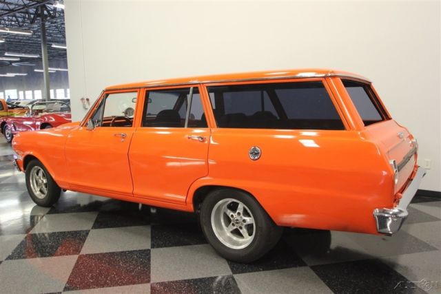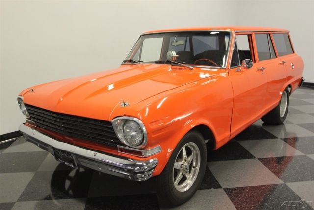 A 1964 Chevrolet Chevy II Nova wagon is the perfect candidate for performance customization. With iconic paint, a powerful stroker V8, and a healthy growl, this one has left its family hauler days in the rear view mirror. Turning grocery-getters into go-fast machines is an art. The best way erase the suburban blues is by painting it Chevy's iconic Hugger Orange. After all, it instantly makes you think of muscle cars like the Camaro... and so does the custom cowl hood. Plus, the Nova's angular style is arguably the best-looking wagon of the mid-60s, and it has a stance that's perfect for an aggressive update. And while there are some great chrome bumpers, this one also has a very nice dark side. The blacked-out grille, custom black rear trim, and dark tinted window package give this some added aggression. The shine and intimidation come together perfectly on the Weld racing wheels with an ultra-wide set in the back - exactly where the power meets the ground. Inside this one has been upgraded for comfort with fresh door panels, a taut headliner, and cloth bucket seats borrowed from a later-model GM car. Plus, the rear seats were upgraded, too, to give this a nice uniform feeling. There are even provisions for an AM/FM/CD stereo. But this updated wagon is far from a coddler. You'll slip behind the Grant sports steering wheel, and your right hand will instantly be attracted to the Hurst Quarter Stick shifter (connrectd to a strong TH350 three-speed automatic.) As you look across the dash, you'll spot toggle switches for components and a full auxiliary gauge trio. Plus, that huge Equus tach with shift light prominently mounted in the center lets you know there's something wicked under the hood. This motor is equal parts shine and toughness. That's why the bold block paint, welded aluminum valve covers, polished pulleys, large intake, and tall air topper all radiate from within the dark engine bay. And more than just look powerful, this is a 383 cubic-inch stroker V8 with all the go-fast goodies you demand. It includes a large Holley four-barrel carburetor, Edelbrock hi-rise intake, Holley aluminum heads, and a large aluminum radiator w/electric fan to keep it all running cool. Plus, we know you love the way those Hooker headers have a custom bend out of the inner fenders like a gasser. Not only do they add even more power, but they also contribute to the thunderous sound of the dual exhaust. And as you follow those pipes in the undercarriage photos, you're going to see plenty of reinforcements for all this power, as well as great upgrades like front disc brakes and adjustable traction bars. Brute force in a grocery-getter package - this is a very cool custom, and the price will never be better. Don't miss out, call today!