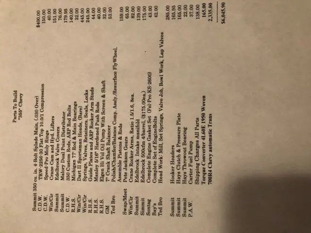 Continue with Engine Specs. Edelbrock 4-barl intake with 500cfm carb, Hooker headers, Crane valve springs & retainers, Crane rockerarms (1.5 / 1.6 ratio), push rod guide plates & screw in studs.Transmission: 700R4 completely built for this engine (new in 10/30/12) To many parts to list on trans, have all receipts.