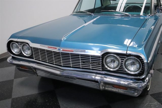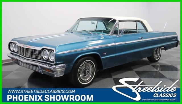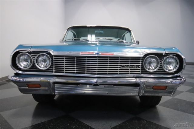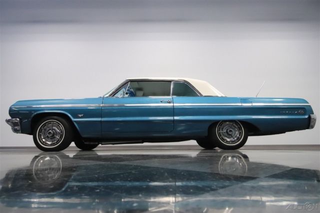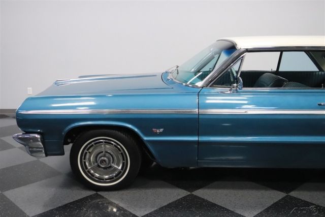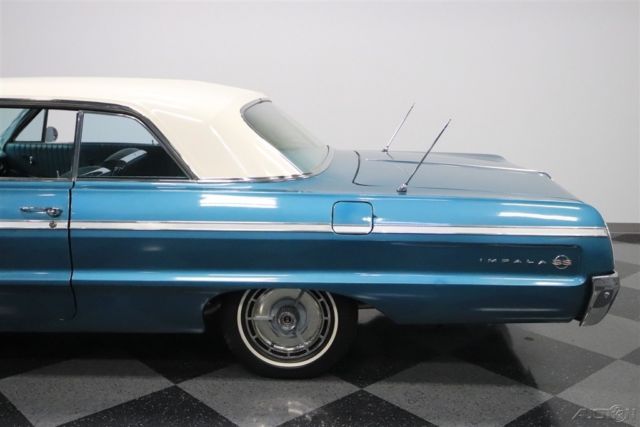Classic cars are all about enjoying the drive and looking good doing it. That's what's great about this 1964 Chevrolet Impala SS. It's a real-deal Super Sport in a two-tone with all the best trim. Plus, with upgrades under the hood to keep you running smoothly, it's the perfect cool cruising classic. This is a desirable year to own an Impala. It has some of the crispest lines of the third-generation, and at the same time, it was ushering in the sportier curves of the fourth-generation that would arrive the next year. The total effect is a unique and commanding presence that has made the '64s an in-demand vehicle. And this one really turns up the style even further. The aqua paint with Ermine White roof is a great way to represent 1960s premium. Plus, the Impala's six-taillight arrangement is a legend all on its own. And for lovers of brightwork, the wraparound bumpers, full-width grille, dual aerials, and correct SS wheel covers should strike all the right iconic tones. But the brightwork we think you'll enjoy the most is the full-length spear that runs from headlight to taillight. Now only do the super-straight panels help highlight the quality of the sheetmetal, but also It has a terrific machine-turned insert that provides a nice bridge to the interior. The aqua vinyl interior is complete and taut, so it looks great against the exterior. As a true SS car, you know that means the comfort of bucket seats and a center console. Plus, the thin rimmed steering wheel and all the machined aluminum that matches the exterior trim are elements that define 1960s class. There are even provisions for air conditioning. And while it all looks factory-correct there are some great subtle upgrades. For example, the radio looks vintage, but it's really a modern AM/FM digital tuner. Plus, the auxiliary gauge trio below it keeps you informed on what's going on in the engine bay. The 327 cubic-inch V8 is now an icon in the small block Chevy circles, and that legend began in this generation Impala. So it's especially nice to have a powerplant that looks quite factory-correct under the hood. But the secret to this coupe is that it was rebuilt around 1,000 miles ago. Not only does that add to the reliability, but also as you look at the undercarriage photos, you can tell there also has likely been a recent solid investment in the front suspension. So if that looks like the right recipe for your next cool cruising classic, then you'll also be excited to know about features like the power steering and upgrade to front disc brakes. Add in the sound of the newer dual exhaust and the control of a three-on-the-tree manual transmission for a bit of fun, and you've got a great all-around driver. This is the real-deal Impala SS for people who like to drive their classics. So if you're a true fan, don't wait. Call today!!!