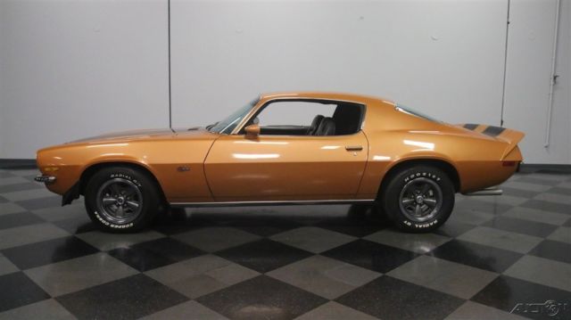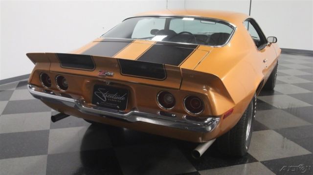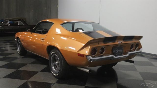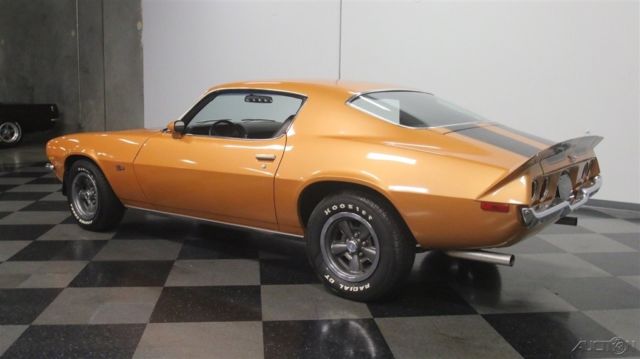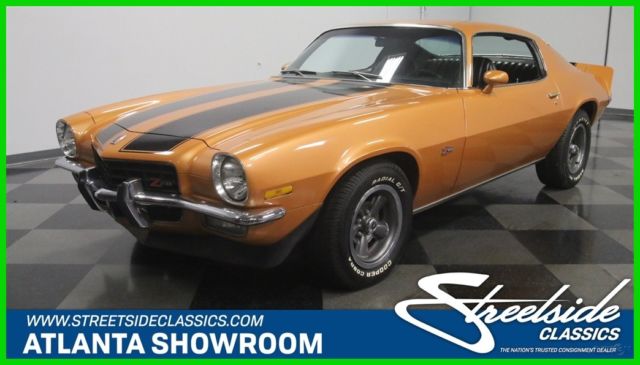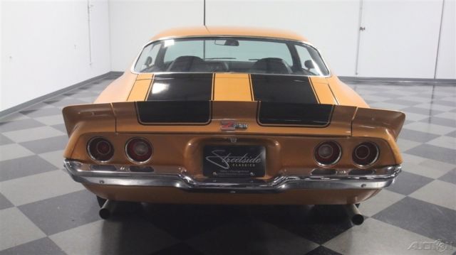 Second-generation Camaros are officially on collectors' must-have lists, and the best ones, like this 1973 Z/28 with matching numbers and a 4-speed are the investments of the future. Wearing its original color combination and some subtle upgrades, it's a car you can enjoy while it appreciates. Code 60 Light Copper is this car's original color, and it's both rare and attractive. With black stripes, there's still no denying that this car looks like a predator as it cruises through traffic. We've sold more than a few second-gen Camaros recently, which confirms their growing popularity, and this one is nicer than most and really stands out. Given its matching-numbers status and a relatively rare 4-speed transmission, someone gave it a quality paint job about 10 years ago, so it looks good with only a few minor signs of use and wear. Lots of tedious block sanding was surely involved, but it paid off, because when the paint went on, the bodywork looks great, even today. As a result, the glowing two-stage urethane paint has a decent shine (a professional buff job would probably wake it up), gaps are pretty, and the car looks the way you'd do it if you were doing it for yourself. It's nice to see that it wasn't dressed up in fake RS regalia, the hood is stock, and yes, that towering rear wing is how they came from the factory. If you're a fan of these cars, you already know what a great place the interior is. With comfortable, supportive high-back buckets draped in supple black vinyl, you know they're serious about performance. The interior is mostly original, from the aforementioned seat covers to the door panels to the carpets to the dash pad, all of which are in good condition, although there's a little curling in the dash pad. The 4-speed transmission and minimal options suggests that someone was looking for all-out performance and this car would have been a legitimate threat on the streets in 1973. To keep an eye on the engine, an aftermarket oil pressure gauge was installed in the dash, and it's quite neatly done. A later AM/FM/cassette stereo seems appropriate in this disco-era muscle car, and there's a Hurst shifter on the transmission, but those remain the only modifications to the interior. The trunk is tidy, and includes a spare wheel plus a space saver spare tire assembly for emergencies. At least the Z/28 got the fastest, most powerful engine available this side of a Corvette, a 350 cubic inch V8 rated at a rather stout 245 horsepower thanks to increased compression and a 4-barrel carb. Nicely dressed with finned aluminum valve covers that recall the original Z/28 and a chrome air cleaner that ensures the engine has enough to breathe, it definitely cackles and snarls the way you'd want your vintage muscle to sound. There's also an Edelbrock aluminum intake manifold, a GM HEI distributor at the back of the block, plus long-tube headers to help build torque. Chevy Orange on the block stands out against the otherwise monochromatic engine bay, but it doesn't look like this car has ever been apart, which is nice. The 4-speed shifts easily and all Z/28s received 3.73 gears out back that make it rather quick off the line. Underneath there's a newer exhaust system that sounds great, reasonably clean original floors, and the original alloy wheels are in excellent shape, wearing 255/60/15 performance radials. Fast, fun, stylish, and ready to rumble, these cars are hot. If you're even remotely considering this one, don't hesitate, because history shows us that the good ones just don't stick around. Call today!