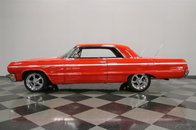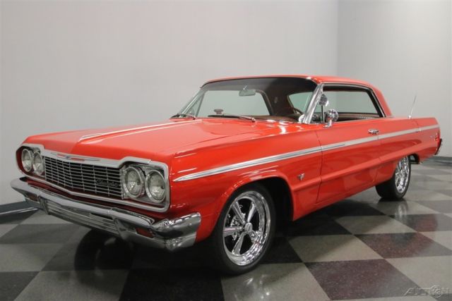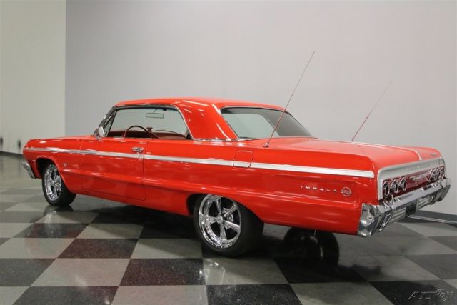 When you roll in a full-sized SS, you are rolling in style! It looks good, it sounds good, and it's got plenty of room to bring your friends with you. Head out to the cruise in for a day of fun, or head for the beach or mountains for the weekend. There is plenty of room to stretch out for the ride, plenty of luxury like air conditioning, and so much room in the trunk you won't have to worry about packing efficiently. Red and chrome always look good together. On a full-sized car with long straight body lines to accentuate, and a rear fender that goes on forever, it looks ever better. Up front, a new chrome bumper leads the way underlining an eggcrate grill with quad headlights. The hood is super smooth and flat except for the ridge of chrome down the center. There is a tapering line of body side molding that starts out on the front fender as all chrome, and transitions to having a machine turned center with chrome edging on the door and ends just over the Impala SS badge on the rear fender. It is echoed by two other body lines that remain in body color and reflect the light along them as the car moves down the street. The trunk has another ridge of chrome running down the center with dual radio antennae on the fenders. The back of the car has another panel of machine turned aluminum trimmed in chrome above triple round taillights and another sweet looking bumper. Open the door and get ready for a treat. Red and chrome is the theme here too. A vertical pleated door panel with an SS badge in the center has a comfortable armrest for those long cruises and power window switches at your fingertips. A red steering wheel with a chrome half circle horn ring with an Impala center mounted on a tilt column. There is a rare factory tachometer built into the dashboard which has a red padded upper with a painted lower and a machine turned aluminum panel running through the center. There is a horizontal speedometer with the factory engine gauges off to the right along with factory cruise and air conditioning controls. An analog navigation system (a compass) is mounted above the rear-view mirror and a digital radio that is AM/FM/iPod/and Satellite compatible hidden under the center console lid just behind the T-handle shifter for the automatic transmission. The front bucket seats are sweet and the back seat is even sweeter for cruising down the road in comfort and style. And let's not forget about that huge trunk! Check it out. You could probably camp in it! Open the hood and you will find an engine bay that is as spotless as the rest of the car with a 327 cubic inch engine nestled neatly down inside it. There is a factory air cleaner with the 327 TurboFire sticker sitting on top of an Edelbrock 4-barrel carburetor. The rest of the engine is wonderfully stock with the valve covers, heads and block painted Chevy orange with the accessories and inner fender wells painted black and polished to a nice shine. All the belts and hoses are new as is the brake booster and master cylinder along with the alternator and fan shroud. As you should expect by now, the undercarriage of this car is spotless too. Power flows back through a 2-speed Powerglide transmission and a cherry bomb style exhaust system gives the car a nice sound. The car sits on 5-spoke Cragar wheels with 245/45ZR18 rear tires and 235/40ZR18 fronts. If you like the idea of rolling in style in a full-sized SS, then get yourself down here and check this car out. You may decide to roll it on home, or to the beach, or to the mountains in it.