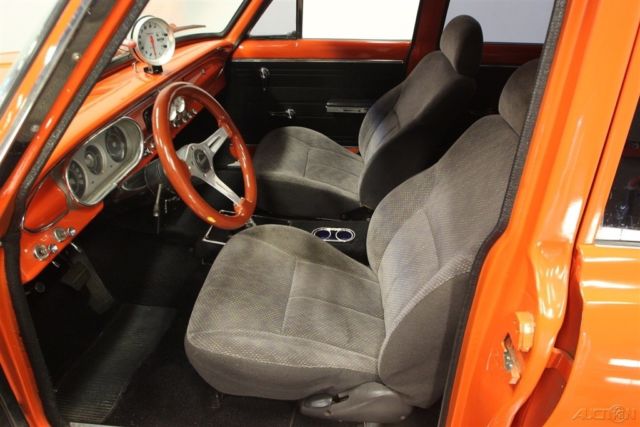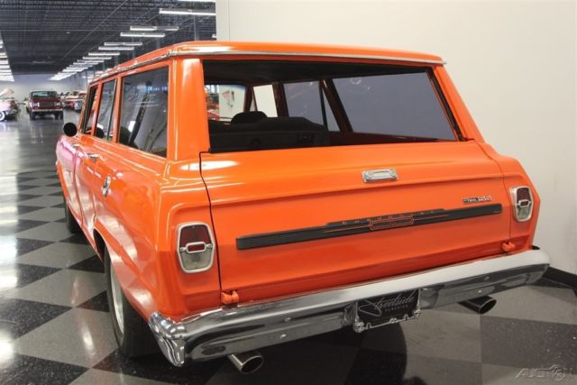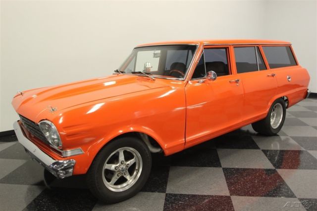 A 1964 Chevrolet Chevy II Nova wagon is the perfect candidate for performance customization. With iconic paint, a powerful stroker V8, and a healthy growl, this one has left its family hauler days in the rear view mirror. Turning grocery-getters into go-fast machines is an art. The best way erase the suburban blues is by painting it Chevy's iconic Hugger Orange. After all, it instantly makes you think of muscle cars like the Camaro... and so does the custom cowl hood. Plus, the Nova's angular style is arguably the best-looking wagon of the mid-60s, and it has a stance that's perfect for an aggressive update. And while there are some great chrome bumpers, this one also has a very nice dark side. The blacked-out grille, custom black rear trim, and dark tinted window package give this some added aggression. The shine and intimidation come together perfectly on the Weld racing wheels with an ultra-wide set in the back - exactly where the power meets the ground. Inside this one has been upgraded for comfort with fresh door panels, a taut headliner, and cloth bucket seats borrowed from a later-model GM car. Plus, the rear seats were upgraded, too, to give this a nice uniform feeling. There are even provisions for an AM/FM/CD stereo. But this updated wagon is far from a coddler. You'll slip behind the Grant sports steering wheel, and your right hand will instantly be attracted to the Hurst Quarter Stick shifter (connrectd to a strong TH350 three-speed automatic.) As you look across the dash, you'll spot toggle switches for components and a full auxiliary gauge trio. Plus, that huge Equus tach with shift light prominently mounted in the center lets you know there's something wicked under the hood. This motor is equal parts shine and toughness. That's why the bold block paint, welded aluminum valve covers, polished pulleys, large intake, and tall air topper all radiate from within the dark engine bay. And more than just look powerful, this is a 383 cubic-inch stroker V8 with all the go-fast goodies you demand. It includes a large Holley four-barrel carburetor, Edelbrock hi-rise intake, Holley aluminum heads, and a large aluminum radiator w/electric fan to keep it all running cool. Plus, we know you love the way those Hooker headers have a custom bend out of the inner fenders like a gasser. Not only do they add even more power, but they also contribute to the thunderous sound of the dual exhaust. And as you follow those pipes in the undercarriage photos, you're going to see plenty of reinforcements for all this power, as well as great upgrades like front disc brakes and adjustable traction bars. Brute force in a grocery-getter package - this is a very cool custom, and the price will never be better. Don't miss out, call today!