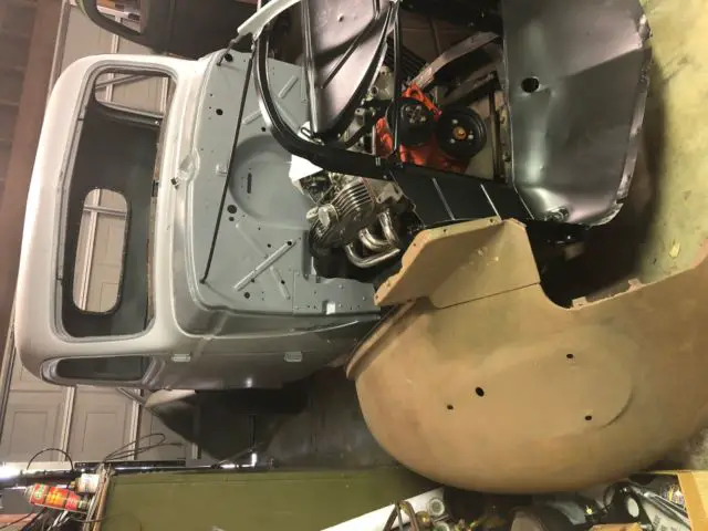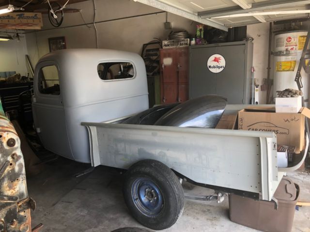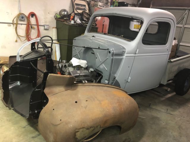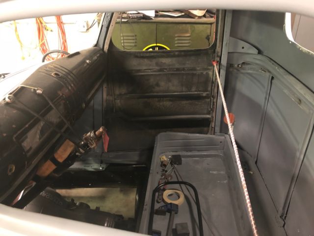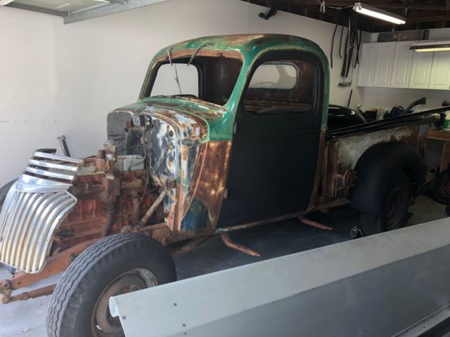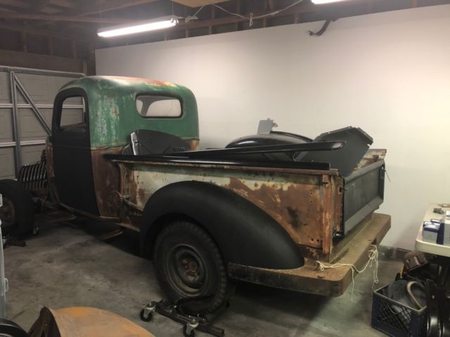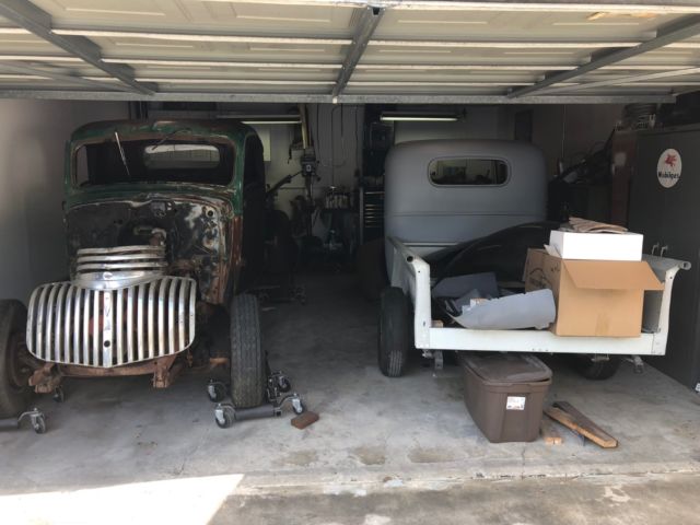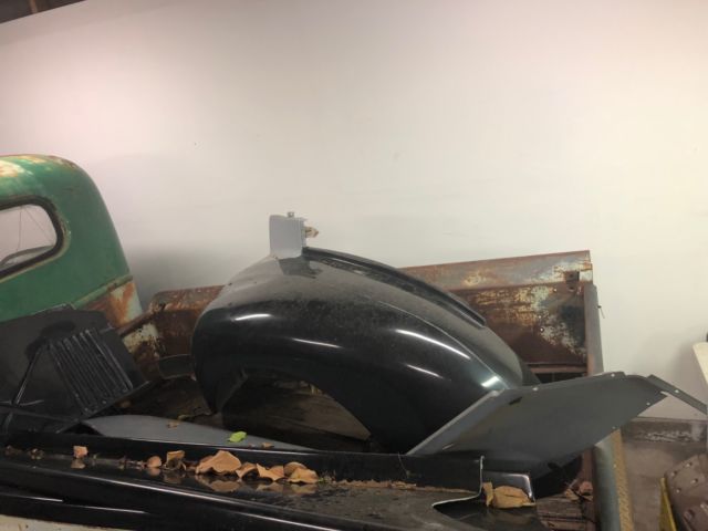 - Clean steel sheetmetal (for its age) with minor dings but no rot- Complete set of Superior Glassworks fiberglass front fenders, rear fenders and smooth running boards- 4" Original Dropped Axle done by Nostalgia Sid's in Oklahoma- Disc brake conversion on the front axle (5 lug conversion all around)- Chassis Components V8 mounts installed including automatic transmission crossmember (V8/Auto pictured not included)- 1968 Nova rear end rebuilt with 3.89 gears and posi-traction- TCI Parabolic rear Leaf Spring kit installed (4" dropped)- Bruce Horkey's Wood Parts brand new complete sheetmetal bed with Maple wood kit- All headlights, grilles and related components and sheetmetal included in duplicate- One cab is super clean (green one) with minimal rust behind the cab, the other cab (grey one) has a fair amount of rust in the windshield surround and cab corners