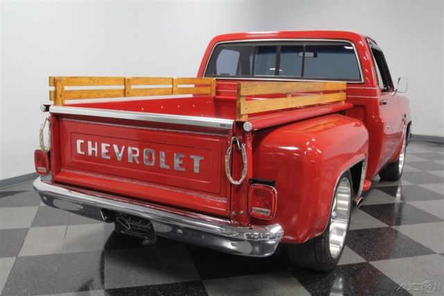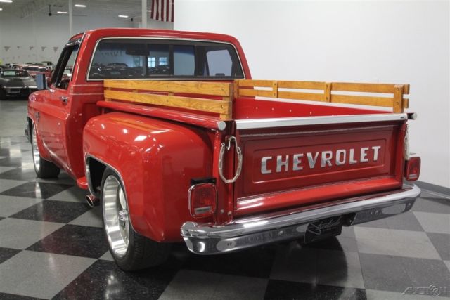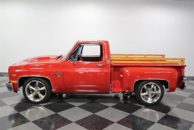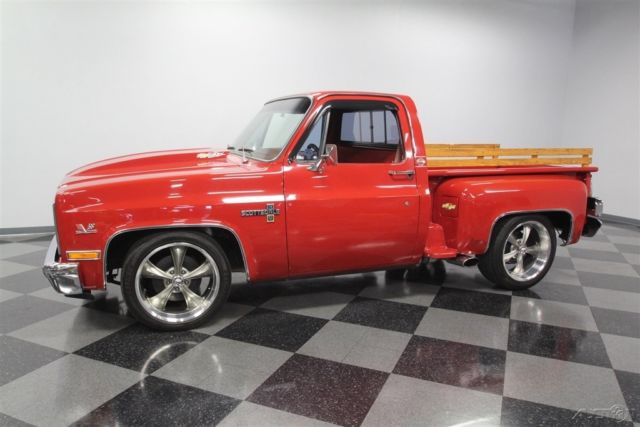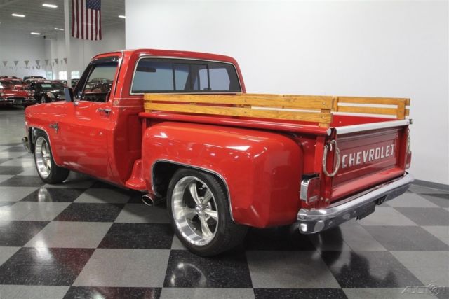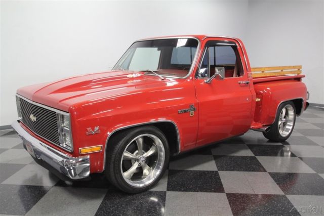 Huge big block power, overdrive transmission, an A/C interior, and it's all wrapped around a slick red body that carries the best of old school and new school looks. So yes, this 1983 Chevrolet C10 Scottsdale really has it all. Classic truck guys remember Dodge's Lil Red Express, and this custom build is what Chevy's answer would have been. After all, the bold red paint gives a serious aggressive attitude to the bow tie's blocky sheet metal. The bright bumpers, billet grille, and mirror-like Chevy lettering on the tailgate add even more flair. You can tell this is true street machine by the upgrades like the cowl hood, wide exhaust pipes on each side, and the large 20-inch Ridler wheels. But it also never loses its roots. This has that great classic truck charm with the traditional stepside bed that allows for a real-wood bed floor. And since the oak they used to upgrade this looked so good, they also added glossy side rails from the same lumber! Inside is more of the custom red attitude. It starts with a bench seat that has a nice pattern to give extra individual bolstering to the driver. Plus, this generation Chevy truck was great about giving the driver a sports car-like wraparound dash. So you'll slip behind the upgraded Grant wood-rimmed steering wheel, and it's an easy reach to everything, including the AM/FM/cassette stereo. You'll love opening the vent window and sliding the rear glass to get the old school truck breezes. And on any day those are too warm, you have cold-blowing R134a air conditioning to keep you comfortable. When you open the hood, you know this truck doesn't mess around. There's a 454 cubic-inch big block filling in the fender walls. It looks great with a glossy presentation and plenty of high performance stickers. And more than just have the logos for upgrades, this big V8 is enhanced further with go-fast goodies like an Edelbrock four-barrel carburetor, Edelbrock intakes, and long tube headers that feed the growling side pipes. This is a big power machine, but there's much more to the build. For example, you have a large radiator w/electric fan to help keep this running cool even if you're in traffic and running the A/C. Plus, this was upgraded with a 700R4 four-speed automatic transmission that can handle all the big power while also providing overdrive comfort. Starting to get the full picture? This is a fine any time machine, and the power steering, dual fuel tanks, and front disc brakes add to this appeal. This truck is a cool custom creation with all the right upgrades. So to find something this bold that's turn-key ready is a true opportunity you don't want to miss. Call now!