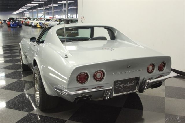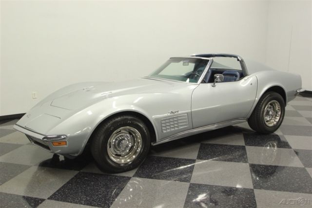 Big block, four-speed Stingrays are always going to be popular. So to find this 1971 Chevrolet Corvette with this level of appeal and some great originality creates the ideal vintage deal. Classic C3s look great in silver. It goes great with all the brightwork elements that these earlier Stingrays received, like the Rally wheels, rocker panels, two-piece rear bumper, and the re-dipped front bumper that also nicely frames the grille. This application of silver paint is an upgrade later in life. It retains a nice luster today, and it really sets off the appearance of a sophisticated total package. Of course, the power bulge in the big block hood is a nice reminder that this looker is no pushover. The factory-correct blue interior appears quite original, and the color looks great against the exterior silver. It's a full package that looks as deep as a blue ocean, with plenty of silver accenting - like the crests of a wave. In fact, if you really want the driving experience to feel like a day at the beach, just open up the T-tops and remove the rear window (one of the final years for this feature.) Corvettes have always been a great personal sports car in providing performance features with plenty of creature comforts to make it a great long-distance cruiser. There's a three-spoke steering wheel that feels grippy in your hands. The dash is filled with auxiliary readouts, and directly in front of the driver is a large speedo and tach. That last one is especially helpful when combined with the stick shift. Lift the hood and see an engine bay filled with big-block power. This 454 cubic-inch LS5 V8 is an era-correct motor, but you can tell there have been some solid investments all throughout its life. After all, not only is it an exceptionally tidy setup, but also it has the right details like the bold Chevy orange paint on the block, mirror-like valve covers, and a matching air topper that advertises the big power motor. It even has been upgraded to a Holley four-barrel carburetor. There's nothing quite like turning the key and hearing this monster motor awaken. Plus, with the numbers-matching four-speed manual transmission, you're always in charge of the powerband and the brutish symphony coming out of the dual exhaust. It's easy to keep all this horsepower corralled with the fully independent suspension. Plus, you have more great driving features such as power steering, four-wheel disc brakes, and BF Goodrich rubber at each corner. Complete with maintenance records ($15k in recent years), you're looking at a slick classic that's also a powerful driver. It's an unbeatable combination that you can take home tomorrow. But the only way to do that is call today!