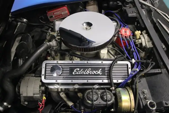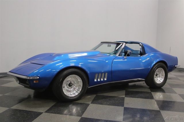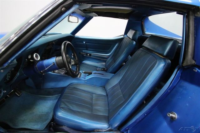 This car means business. Anytime you have a big block with a manual transmission in an early Corvette, you're going to have a smile on your face while you drive it. The colors are factory correct as it was delivered new, the car looks awesome, and it runs strong. Check it out. This car is pumped up and muscular from end to end in its LeMans Blue. But it's not just big bulging muscles. Ok, the big power bulge hood is pretty intimidating. But the rest of the car looks gracefully strong. More like a gymnast than a body builder. It keeps its feet planted firmly on the ground through those beefy tires tucked up under the fenders that curve in and out gracefully cutting a clean shape. It leads with a chrome bumper, one of the last few years to have those, then flows up and over the glass insert T-roof panels then around and down the sail panels meeting the curves of the rear fenders on the deck and blending everything into the integrated spoiler. Four round taillights are a Corvette standard feature and a split rear bumper sits over twin chrome exhaust tips extending out through chrome trimmed cutouts. Open the door and you will find the code 411 Dark Blue vinyl interior that is also the correct color that this car was delivered in new. It is clean with minimal wear and looks extra sweet because it is an unusual color. The door panel has a nice long armrest for long distance cruising trimmed out with chrome piping leading to the door lock and handle. The high back bucket seats have a pleated center section and smooth vinyl bolsters and headrests. A beefy Grant GT steering wheel feels good in your hands and a Hurst short throw shifter rises from the center console just begging to be stirred around. There is a SportComp tachometer mounted on the column with a stock dash and gauges behind it and there is a JVC FM/CD/iPod compatible head unit with Alpine speakers mounted in the rear for your listening pleasure. Pop the hood and you will find 502 cubic inches of big block power nestled down in the engine bay. There is a chrome air cleaner feeding a Holley 4-barrel carburetor with an Edelbrock high rise manifold getting the mixture distributed out to the cylinders properly. An MSD system handles the ignition duties working along with a new set of cap and wires. Ribbed Edelbrock valve covers are painted black with polished ribs helping with oil cooling a bit, and long tube headers get the spent gasses heading back toward dual Flowmaster mufflers and those chrome tips at the rear. Signs of good maintenance include newer belts and hoses as well as a newer alternator. The power flows back through that 4-speed transmission and the rubber meets the road through Mickey Thompson tires mounted on 5-lug Centerline wheels that are staggered with 275/60R15s in the back and 255/60R15s in the front. Factory correct colors, big bad big-block power, and a 4-speed stick shift. Come on down and check out this car. There is nothing more fun that romping on a big engine in a little car.