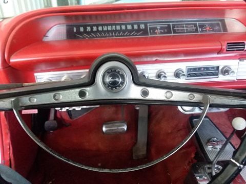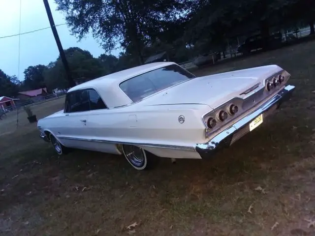 This is a 1963 Chevy impala. It is a ss with 327 V8 power glide transmission White exterior paint. Red Interior. This is a pretty nice car and I am starting out for a fair market value bid.This is a car I traded for and has not been driven. It did come with new floor pans not installed. There is rust in floor pans and trunk pan. The body has some rust but looks to be a very sound car. I know this will make a great weekend cruiser or one to go on a weekend trip. I will give you the choice between rims on the car or ones in picture inside trunk.
