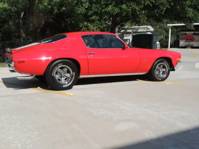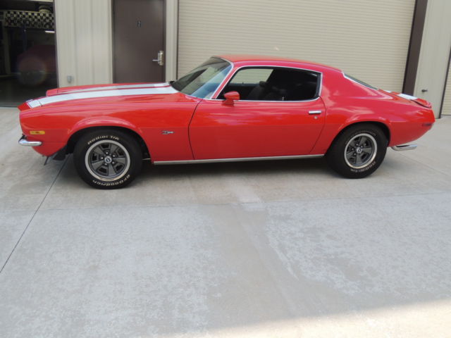 This is an absolutely beautiful and documented 1970 1/2 Chevrolet Camaro Z28 RS that comes with the original buildsheet and the original tank sticker verification. Due to the short model year beginning in February 1970, only about 125,000 Camaros were built and only 7% had the Z28 special performance package. The combination of the Rally Sportappearance package with the split front bumper makes this car even more special and desirable. This car was built in June of 1970 at the Van Nuys GM plant in California and it was delivered to Parkwood Chevrolet Dealership in Lakewood,California. This is a high quality restoration that still looks new in every way. The engine is not original but it is a correct LT1 350ci V8 producing a powerful 360 HP with 380 ft. Ibs. of torque that is correct for the Z28 performance package. TheMuncie M20 4-speed manual transmission with the Hurst shifter is the original and numbers matching. The new red paintwith white painted on stripes is in show quality condition and has an amazing shine. The RS appearance package comeswith the blacked-out grille, the unique split-bumper and the rally-styled parking lights and you also get the bright RSemblem on the original wood grained steering wheel. The interior is in excellent condition and has the correct factory DLXinterior with new custom black vinyl Strato bucket seat covers, adjustable headrests, shoulder seat belts, the optional 055code floor console and the wood grained door panels. It has power steering, power brakes, 3.73: 1 ratio axle and 12 boltPositraction limited slip and has the F41 suspension which means there is a front and rear stabilizer bars. The car is loaded with many new and correct parts that have been on the car for less than 100 miles. It has new headers, new Flowmaster dual exhaust, new correct front carpeting, new glass, new gas tank, new front suspension, new shocks, new clutch, new correct lower dash, new correct gauges with LED bulbs. An oil pressure gauge has been added in the floor console. All the gauges work, even the clock! The new AM/FM stereo radio is correct with the latest digital technology for a clean, powerful sound that comes from the front center speaker and the two rear Kenwood speakers. The car sits on correct Z-28 wheels with BF Goodrich TA Radials, P225/60R15's on the front and fat P275/60R15's on the back. The trunk is in excellent condition and comes with the correct jack and correct expandable spare tire. The hood is in excellent condition and the engine and engine bay is very clean. This car is solid, with no rattles and no squeaks.