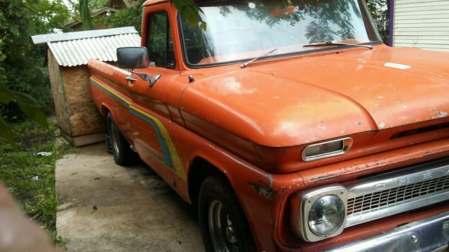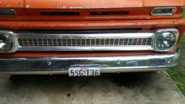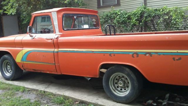 THIS AUCTION IS FOR A VERY SOLID 1964 CHEVROLET C10 LWB TRUCK. I PURCHASED THIS VEHICLE ABOUT A YEAR AGO WITH THE INTENTION OF DOING SOME RESTORATION ON IT AND JUST DRIVING IT ON WEEKENDS OR GOING TO CAR SHOWS. WELL, A NEW BABY CHANGED MY PRIORITIES SO NOW I AM SELLING IT BECAUSE I NEED THE MONEY AND I WILL NOT HAVE ANY EXTRA MONEY TO PUT INTO IT ANY MORE. THE TRUCK IS JUST LIKE I PURCHASED IT ONE YEAR AGO SO I HAVE NOT PERSONALLY PERFORMED ANY OF THE CHANGES OR MODIFICATIONS FROM STOCK THAT YOU SEE SO I CAN ONLY EXPLAIN TO YOU WHAT CHANGES WERE MADE AT SOME POINT, WHAT I WAS TOLD BY THE PREVIOUS OWNER WHO DID PERFORM THE CHANGES AND BY WHAT I HAVE BEEN TOLD BY A MECHANIC WHO EXAMINED THE TRUCK FOR ME PRIOR TO MY PURCHASING OF IT. THE BODY ON THE TRUCK IS VERY SOLID EXCEPT FOR A FEW AREAS THAT USUALLY ARE PRONE TO RUST LIKE THE FLOOR PAN RIGHT BELOW THE DOOR WHEN IT CLOSED, THE DRIP RAIL ON THE CAB, THE WOODEN BED AND RAILS AND A FEW MORE SPOTS HERE AND THERE. THESE AREAS ARE NOT IN REAL BAD SHAPE BUT THEY WILL REQUIRE ATTENTION IF YOU ARE GOING TO RESTORE THE TRUCK. THE PAINT IS NOT ORIGINAL BUT IT IS AN OLDER PAINT JOB AND THE SIDE RACING STRIPES WERE ADDED YEARS AGO AS WELL. THE PAINT IS IN DECENT SHAPE FOR ITS AGE, THE INTERIOR OF THE TRUCK IS PRETTY MUCH STOCK EXCEPT FOR THE SEATS ARE NOW COVERED IN BLACK LEATHER AND THEY ARE IN GOOD SHAPE. THE WOODEN BED OF THE TRUCK IS ORIGINAL BUT NEEDS TO BE COMPLETELY REPLACE DUE TO THE WOOD ROTTING. THE TAILGATE IS NOT PICTURED ON THE TRUCK BUT I DO HAVE ACCESS TO IT AND WILL INSTALL IT PRIOR TO IT BEING PICKED UP. I DO NOT KNOW IF THE TRUCK HAD A V6 OR V8 ORIGINALLY BUT IT HAS BEEN REPLACED WITH A 350 V8 FROM A 1976 MODEL TRUCK AND A ALOT OF UPGRADES HAVE BEEN PERFORMED TO THE ENGINE AS SEEN IN THE PICTURE AS WELL AS INTERNALLY. I CAN TELL YOU THE TRUCK IS VERY FAST AND WILL SMOKE THE TIRES UNTIL THEY POP IF YOU SO CHOOSE.LOL. THE STANDARD TRANSMISSION HAS BEEN CHANGED OUT TO A LATER MODEL AUTOMATIC AS WELL AND THE SHIFTER IS LOCATED ON THE FLOOR. THE EXHAUST HAS BEEN ROUTED TO SIDE PIPES. THE TRUCK COMES WITH FOUR MATCHING CHROME RIMS AND 4 TIRES IN FAIR CONDITION BUT THEY ARE IN DRIVEABLE CONDITION. THE TRANSMISSION SHIFTS SMOOTHLY. THE ENGINE RUNS VER, VERY WELL BUT IT WILL NEED A NEW BATTERY AND I JUST STARTED HAVING TROUBLE WITH THE RADIATOR LEAKING BUT IT HAS NOT GOT HOT. IT IS A SLOW LEAK SO YOU CAN DRIVE IT BUT THE WATER LEVEL JUST NEEDS TO BE WATCHED. IT USES NO OIL AND DOES NOT SMOKE. THE GLASS IS ALL PRESENT BUT THE WINDSHEILD DOES HAVE A CRACK IN IT.. ALL TRIM AND BUMPERS ARE PRESENT AND IN GOOD SHAPE EXCEPT FOR THE REAR BUMPER WHICH DOES HAVE SOME DINGS AND SMALL DENTS IN IT. SO THERE YOU HAVE IT. THIS HAS ALWAYS BEEN A DRIVER QUALITY TRUCK AND IT HAS BEEN KEPT UP WITH FAIRLY WELL FOR THAT REASON. PLEASE DO NOT THINK YOU ARE GETTING A TRAILER QUEEN OR A SHOW TRUCK BECAUSE YOU ARE NOT. IN MY OPINION IT WILL NOT TAKE MUCH TO GET THIS TRUCK INTO SHOW CONDITION BUT IT DOES NEED WORK TO DO SO. THIS TRUCK CAN BE ON THE ROAD AGAIN FOR ONLY A FEW HUNDRED BUCKS WHICH MAKES THIS AN IDEAL CANDIDATE FOR A ROLLING RESTORATIO, A FIRST CLASSIC VEHICLE, SHOP TRUCK OR A COMPLETE NUT AND BOLT RESTORATION.