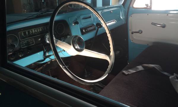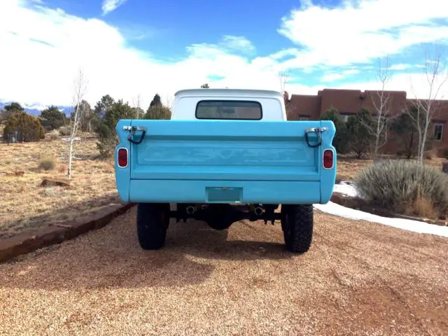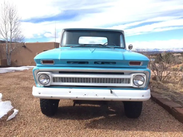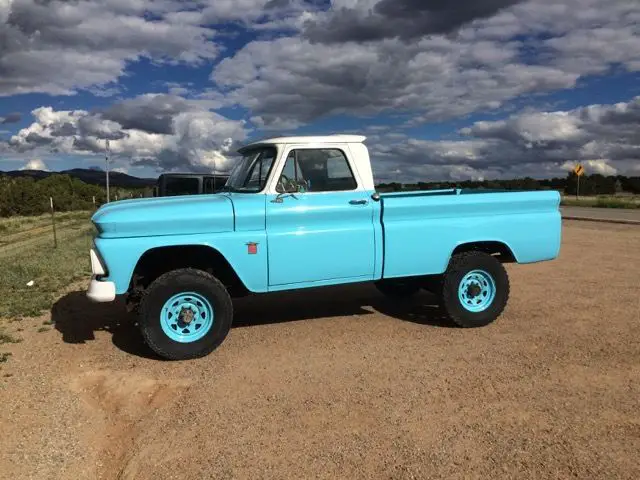 THIS TRUCK WAS A C10 THAT HAS BEEN MODIFIED INTO A K10 4x4. Chevy short bed pickup with 3/4 ton axles and brakes. Newish Turquoise exterior with black interior. Original Muncie SM420 4 speed manual transmission and Rockwell T221 Transfer case - works perfect. 350 V8 Engine with brand new dualexhaust systemfrom engine to tailpipe. Engine Heater that plugs into an outlet. Tachometer. 4 Wheel Drive - Low and High. CD Radio. All gauges work. Heater works. Odometer works showing 76,300 miles, but not accurate. Fairlynew tires. Recent carb tune up and new bushings on transfer case. Just had front end alignment. Non-smoker, Runs & drives great. Needs new wood bed and does leak oil some from oil pan, transfer, and rear differential, after all it is 52 years old. Tail gate says GMC, not Chevrolet, but that is notnoticeable WORKING ODOMETER SHOWS APPROXIMATELY 75,000 BUT NOT BELIEVED ACCURATE.