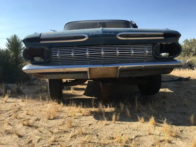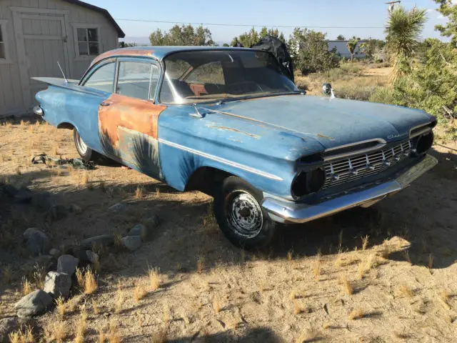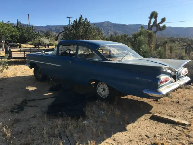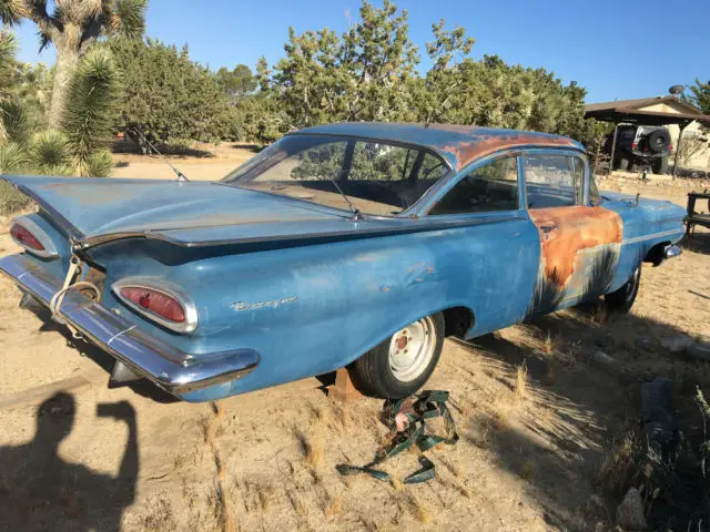 Really clean 59 Biscayne you don't see them this clean anymore, has 350 Short block and 350 trans between the frames (NO FULL MOTOR), the car is VERY VERY straight the trunk floor is good shape the front and rear pans need to be replaced they have been cut out already, and have the passenger side replacement pan ready to go I have the all the gauges and the seat frames for the front and back although they are not pictured also have the headlight buckets and bezels!! the Valances are in good condition not rusted out.