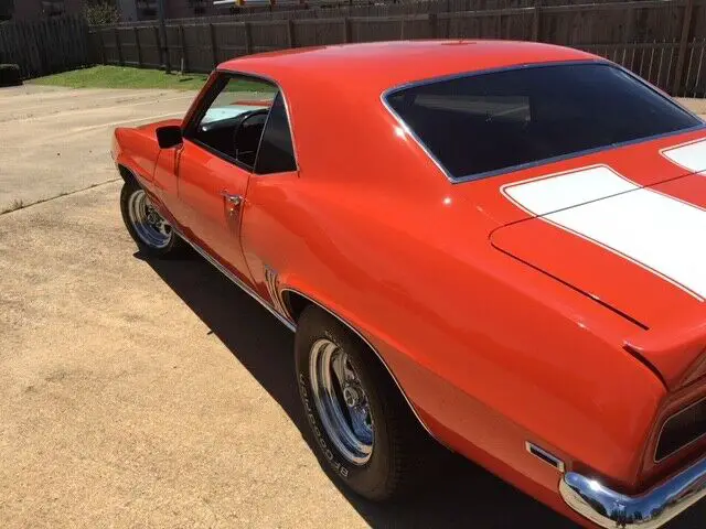 1969 Camaro Z/28 X77 Hugger Orange/white stripes black interior. The car now has a 350 in it the 302 is long gone. It starts really good and runs good and does not smoke or make any funny noises. The carpet and seats look really good and there is no funky odors inside! The paint on the car is very nice but not show quality. I would say it is better than driver quality and is very presentable. It has a nice shine to it but there are a few imperfections.The car has had the front end rebuilt as you can see in the pics and a new quick ratio power steering sector has been installed. The car has had a complete rebuild on the M21 Transmission with a new clutch and pressure plate and it all shifts perfect. The rear axle is a 12 bolt with a posi track. The wheels and tires are like new and the brakes are disc on front and drum on the rear. This car grabs attention when you drive it and it sounds good so you will get a lot of thumbs up!