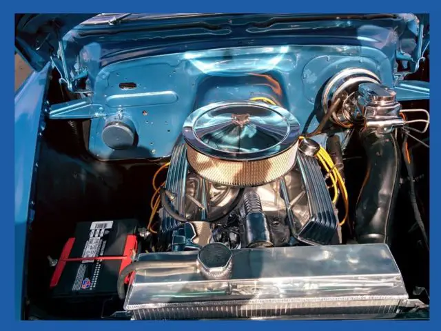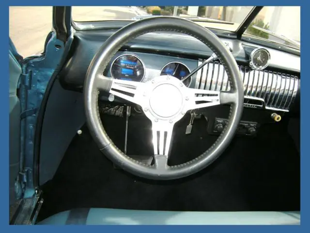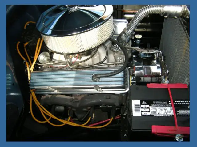 This Bowtie is finished in a striking light blue metallic hue with a glistening white top. It recently received a transfusion in the form of a new 350 CID V8 and freshly rebuilt TH350 transmission. There is approximately 3400 miles on the new drive train. The Mustang II independent front suspension is also new with power steering and disk brakes. Not only does it look great, the car purrs like a contented cat, and drives along at freeway speeds without guzzling much gas. The engine is fitted with an aluminum intake manifold and 650 cfm Edelbrock AFB carburetor, and ramhorn cast iron exhaust headers. A fat aluminum radiator with dual electric fans ensures the car runs cool under all conditions.