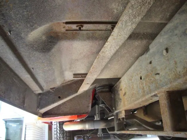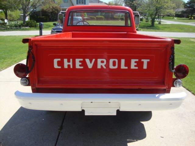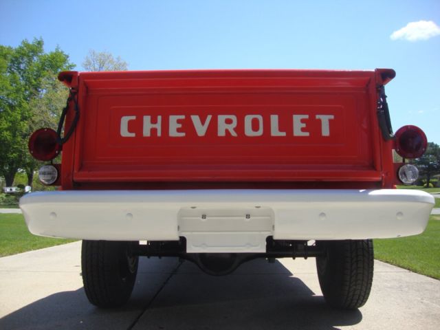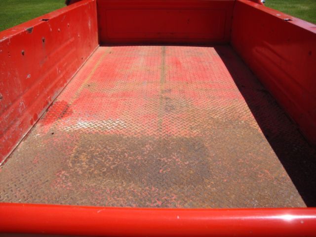 Body: All original rust free (bar surface rust/scale) frame, body panels. All known/typical prone rust areas are clean. All original paint except right bed step, rear bed light posts, and bumpers. Right step replaced with NOS due to hole drilled in step. Original step comes with truck. Bumpers were power coated. Front/rear sections of frame cleaned and painted. Center section not complied with. Original frame markings left in place. Original fire-wall markings left in place. Bed has original wood floor. Fire Dept. tack welded diamond plate over wood to help support the water tank. You can see the wood floor from underneath, see picture.