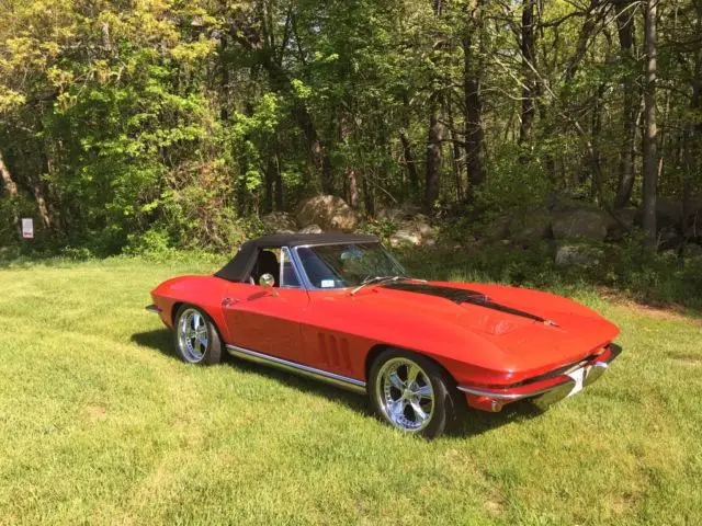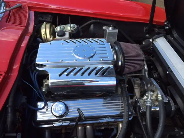 New Rally Red paint with ’67 Corvette Stinger hood and new black canvas convertible top. Full body off documented restoration with new Painless Wiring harness. Power is delivered by a 425Bhp 383ci GM Performance crate engine with AFR aluminum heads and Edelbrock fuel injection. A new aluminum radiator with dual electric fans keep the fully dressed engine with a March serpentine pulley system and custom Walter Prosper Air Cleaner cool. To handle the power the drivetrain and suspension have been completely upgraded with a hydraulic clutch, Tremic 5 speed transmission, new drive and half shafts and fully adjust VBP Performance Plus Suspension Kit. To get the power to the road, rear 265-45x18 and front 235-45x17 Hankook tires mounted to Foose Nitrous 5 Wheels have been added. A VBP sport stainless brake package with slotted rotors and Hawk pads were installed to ensure this Corvette stops as good as it goes. Borgeson power steering has been added to keep the handling precise and the headlights have been upgraded to halogens to ensure you can see where you’re headed.