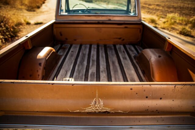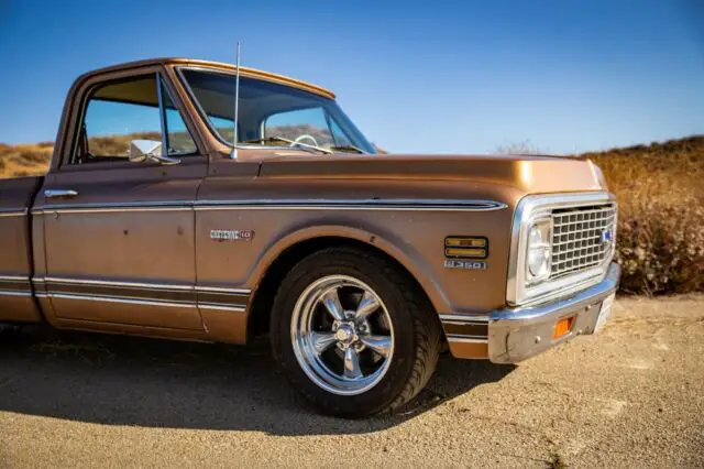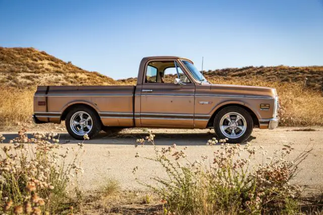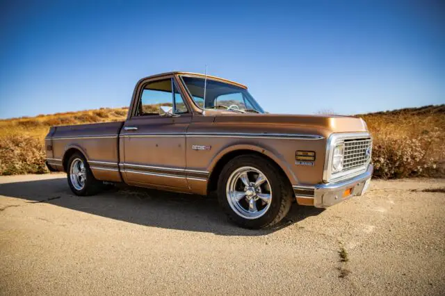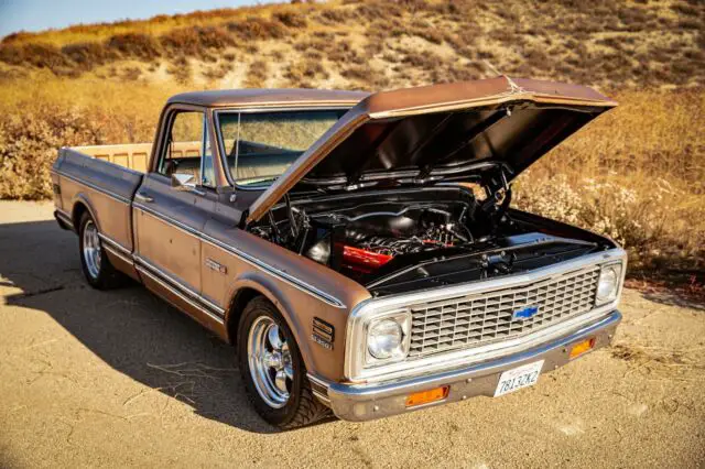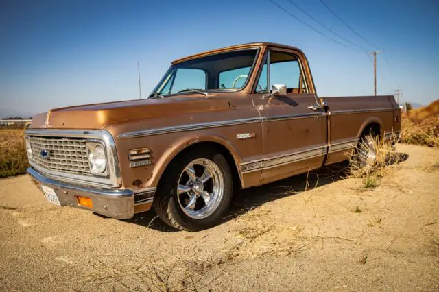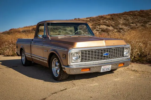 This is a one of kind RestoMod 1971 Chevrolet Cheyenne C10. The project started with a solid farm fresh truck from Wyoming. The truck was repainted in the 70's from it's original Ochre Yellow/White to it's current Golden Brown color. On the outside, the truck has an incredible patina from mother nature and the perfect amount of wear and use that everyone is trying copy. The cab/bed and front clip were removed and the chassis was cleaned and painted black. The truck was originally a long bed, so we cut/boxed the frame and cut the box down in both the front and back to retain the look and to make a proper short bed. The cuts in the bed were left natural and are now part of the patina on the truck. The wood in the bed is original from 1971. The floor pans are like new and still have factory paint on them. The back of the truck has new 4" drop springs from Brothers and the front springs were cut to level the truck. There is a new wiring harness from the cab back and also in the front for the LS1 conversion. The old 350 was removed and the engine bay/firewall were completely redone which makes this truck a complete sleeper from the outside. The firewall was cleaned and smoothed and custom hand-built sheet-metal covers were added to the sides of the engine compartment and along the top of the grill/radiator. We mounted a new Wilwood Brake master cylinder with proportioning valve that works great and keeps the look super clean. The LS1 is mated to a 4L60e electronic transmission and runs and shifts perfect. The plastic covers on the motor were all removed, the engine was painted black and orange, and added details like the custom painted vintage Chevy valve covers to give a period look. The motor blows people away every time when the hood is opened. It includes a new dual electric fan set-up to ensure it always runs cool in Southern California. The fuel tank in the cab was removed and replaced with a new tank under the bed along with new fuel regulator and fuel pump for the LS1. The motor includes new headers and it was finished with a complete new custom 3" exhaust that provides just the right amount of sound outside the truck. The inside of the truck has new carpet, new dash pad, new headliner, visors and includes a vintage GM steering wheel, custom painted gauges and custom pin striping that matches the hood and tailgate. There are new 3-point seat belts for the driver and passenger and a new center belt for the 3rd passenger. The door panels are original Cheyenne panels that give it that authentic look and feel. The truck has a vintage GM Custom Mark IV aftermarket air conditioner that is hooked up to the LS1 and blowing cold air. The front glass has a new gasket and new glass, the rear window has a new gasket and the doors both have new seals. Sound deadening material was added to the entire floor and back of the cab, the roof under the headliner and also the doors. The truck is riding on new American Racing wheels with 255/50/17 low profile tires that complete the vintage look. I have driven the truck about 1500 miles with about 800 of them on a trip from Wyoming to Southern California and the truck was perfect. It is fun to cruise around town or drive 80mph down the freeway in it. I bought another C10, so it is time to move this along to a new owner.