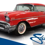 It's no secret that we love 1957 Chevys here at Streetside Classics, but the way they sell also proves that you love them too! With timeless looks and the ability to become just about anything you can imagine, there are few better choices for your next car than this lovely 210 2-door post coupe that's been priced to move. Vivid red is the iconic finish you want in a Tri-5, but I can guarantee none... of them looked this flashy in 1957, especially with the custom red-and-white checkered flag that was integrated into the rear quarters in between the 210 trim of this one. Thanks to a solid restoration, it was given a driver-ready makeover that included smoothing the body, straightening the panels, and making sure that the red paint had a good shine and presented well. It's certainly not perfect and closer examination will reveal signs of use here and there, but that only proves that the car is working as intended. The bright finish suits the '57 just fine and on monochrome cars, the 2-door post body style works better than the hardtop to show off the dramatic styling cues, looking very dashing indeed. And you already know that chrome isn't cheap and the '57 is literally covered in the stuff, so there's a small fortune wrapped up in the details on this car and although it's not perfect the contrast definitely delivers and it shines up well- so it was worth every penny! The interior is as subtle as the exterior is flashy, although it's not without its custom touches either. With gray tweed on the bucket seats and rear bench, they didn't stray too far from the original recipe, although the fabric is probably a lot more comfortable on warm days than the original stuff, and the red accents on the seat-backs and door panels mirror the checkered flag on the exterior. Pleats are a safe bet for a vintage look, but the door panels have been upholstered using multiple patterns that recreates the '50s vibe. On the other hand, the bright red dash still houses the original round instrument pods, which allows the stock dash to remain, well, stock. Modern A/C has been very discreetly mounted underneath, joined by dual set of auxiliary gauges to help monitor the engine's vitals. Neatly fitted plush red carpets provide added insulation and noise reduction and even the retro-sound AM/FM/AUX radio doesn't call attention to itself inside the original factory slot. The trunk is tidy, too, with plenty of room and a protective mat. Small block Chevy power is a given in a '57 like this, and it's obvious that not only was it built to drive, but that someone intended for this one to last a good, long time. The usual stuff, like a Quadrajet carb and ceramic-coated long-tube headers helps it build power, and for easy starts there's an updated ignition system and alternator. Edelbrock chrome valve covers and a matching mini air cleaner add a little flash to the engine bay and there's a big radiator up front keeping the whole show nice and cool. The front disc brakes are powered by a newer booster and dual master cylinder, power steering makes driving a breeze, and with the 3-speed manual transmission this car is an absolute blast to drive as you cycle through the gears. An original-style rear-end handles all the power without issue, and the dual exhaust system is quiet yet rumbly enough for an all-day haul with no side-effects. Brand new American Racing Torque Thrust "Old-Style" wheels wear modern 215/65/15 Cooper Cobra white-letter performance radials at all four corners to complete the look. You can probably count on this car landing a new home pretty quickly, given how well finished it is, and there's definitely no shortage of '57 Chevy fans. Call today!