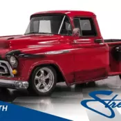 A push of a FOB button and the doors crack open electronically, and this is a good thing because the handles have been shaved! Door panels are the raw steel without any panels, although wood blocks have been fashioned to hold power window toggles. Red velour cloth seats which look vaguely familiar as my guess would be from a Monte Carlo show in bucket form in the front, and a rear bench has been mounted to the floor. The dash has been resprayed with exterior matching red, and some original horizontal ribbed chrome adorns the center and glove box panels of the dash front. In front of the driver are 2 circular gauges, one a cluster for oil, battery, temp, and fuel, and the other a speedometer. This have very nice chromed bezels, and black fields with a perking of white lettering and pointers. A few small lights can trip your trigger when this truck is started. Air conditioning hangs below the dash. A note about the interior paneling as it is nonexistent save for the original "particleboard" inserted within the frame structure. The headliner is also nonexistent and shows the bare steel (although painted red) above the passengers. A rear camera screen hovers above the windshield and works perfectly.