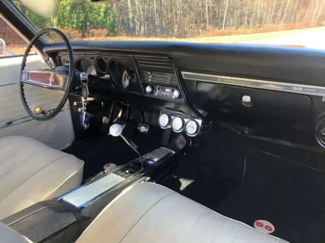1969 Chevelle SS 396/450hp (Not original engine) Muncie M-21 4-sp, true SS Paint code correct #72 Monaco Orange, with color code correct Parchment white bucket seats with center console, and white vinyl top. Power steering, front disc brakes. Now with 454 engine stamp (TL13XXA5) with Reher Morrison performance heads, double roller timing chain/ gears, 700 dual feed Holley carb. Aluminum edelbrock intake, Moroso oil pan 6-qt, Comp cam, Hooker ceramic coated headers with flow master, SS exhaust chrome tips, fresh Posi3:41gears, boxed control, F-41 rear sway bar, Edelbrock Anti rear hop bars, I currently have two sets of wheels BF Goodrich T/A radials 225/70/14 with factory correct Rally SS, also for consideration Corvette Rally wheels with new Cooper Cobra GT front 15x7 225/70/17 rears 15x8 275/60/15. This chevelle handles and drives great straight and tight, and along with zero leaks, and with no non defects. All chrome trim and glass in great shape, very clean and solid floor pan and trunk. Everything in working order aftermarket gauges, Tac, JVS sound system updated to glove box AM/FM/CD with remote eye, dash cluster upgraded to white face speedometer and gas gauge, along with new bezel and dash pad.