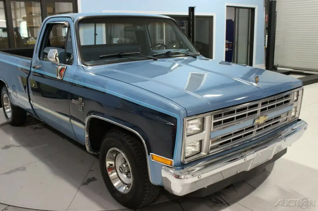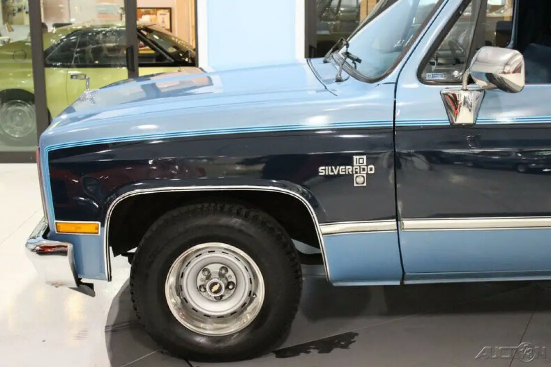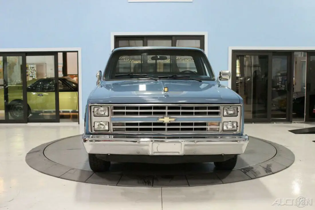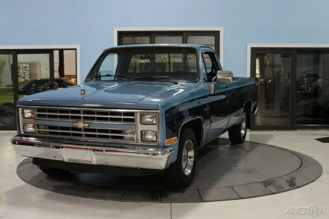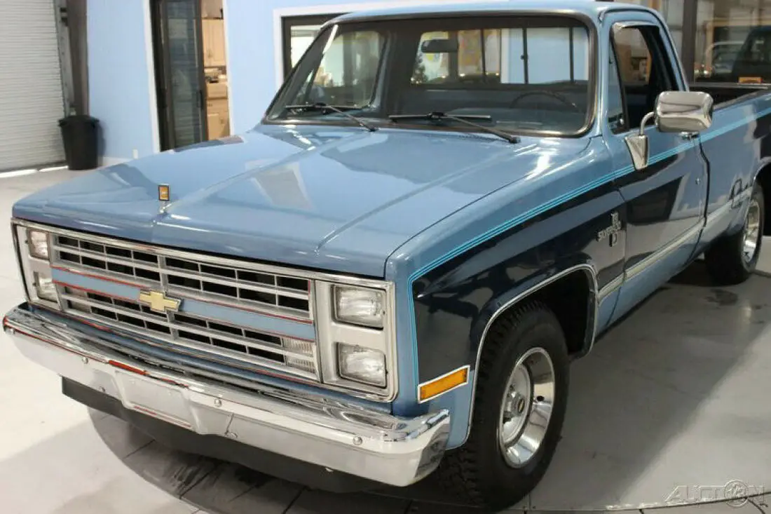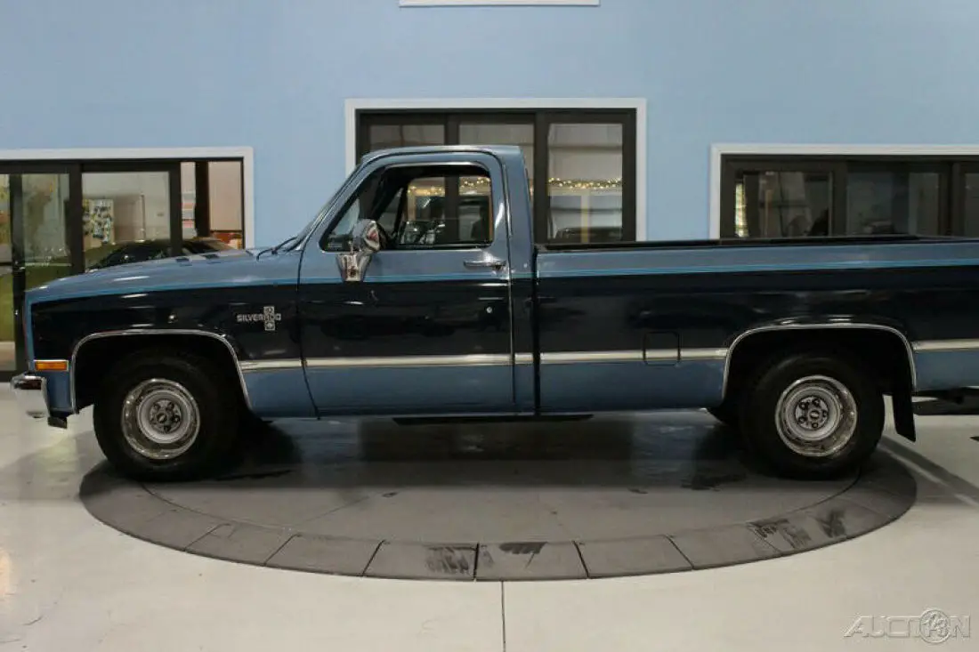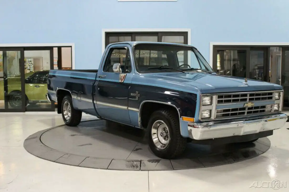 1987 CHEVROLET SILVERADO Why This Car Is Special The 1987 Chevy C10 Silverado pickup Truck we have here at Skyway Classics has a very nice two-tone metallic dark and light blue paint scheme and looks as it did when it was brand new. Mechanical Our C10 still has its numbers-matching small block Chevy V8 fuel injected engine has more than enough stock horsepower and torque plus gives you great gas mileage. It all looks factory fresh sitting in the engine bay and it is detailed and painted, has the factory black cleaner and valve covers, stock exhaust system, air conditioning, a 3-speed automatic transmission, 10-bolt rear end, power steering and power front disc brakes. It rides on the original wheels Rallye type chrome and silver wheels with chrome trim rings and Chevrolet caps, and black wall tires all the way around. Interior Our Chevy features a blue cloth bench seat with matching blue door panels, carpets, headliner, and dash that look remarkable and well-preserved. Options include factory A/C, power windows and locks, cruise control, and a tilt steering column, factory steering and gauges, an AM/FM stereo system, and factory seat belts. Exterior Like we stated earlier, the dark/light blue color combination sets the Chevy apart from the more mundane colors that some have and the trim, chrome side mirrors, over-the-rail bed liner, and sliding rear window all add to one heck of a nice truck. Conclusion This 1987 Chevy C10 pickup we have at Skyway Classics has a stunning color combination, is well-equipped, and you will have a hard time find a better one for the money. Check it out today. So give us a call at 941-254-6608.