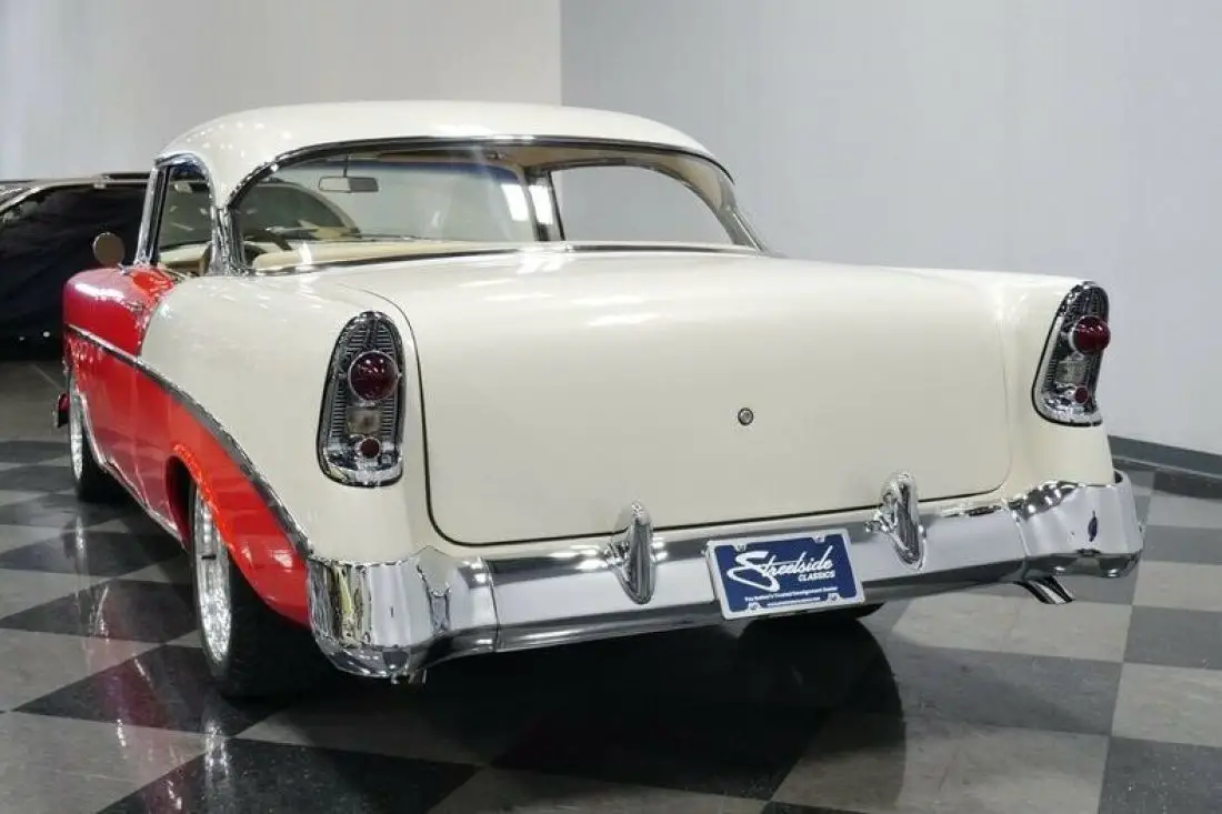 The two-tone red and white color combination is exactly how you want this classic to look. The extra luster is courtesy of a more modern respray in a PPG Tricoat, and there's so much detail work that it's probably the smoothest steel you'll ever feel. It sets the tone perfectly for how you want to be seen in this coupe: a great classic that has been enhanced for a little more "look at me!" attitude that happened back in the day. But more than just nostalgia, make sure you take some time to look at how it gets the fundamentals correct. All the body panels fit well, the doors close with authority, the chrome king bumpers shine like mirrors, and all the intricate trim specific to the '56 is complete. But this cruiser can do so much more than just let you live your American Graffiti fantasies. Those large 17-inch American Racing Torq Thrust alloys signal that there's more to this hardtop than just it vintage appeal.