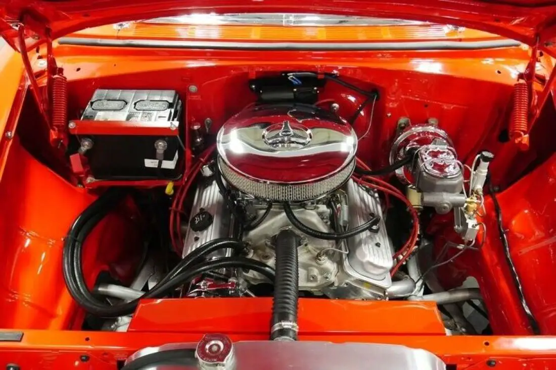 The interior is tastefully upgraded so that you get plenty of convenience without jeopardizing the vintage attitude. For example, you still get the classic split bench set up front, but now it's finished in supple leatherette. This cream color is continued on custom contoured door panels, headliner, and dash. It combines with the bright red carpeting to follow a similar tone of the exterior for a stellar look inside and out. So this will have you keeping all the windows down on this pillarelss hardtop just so everyone can get a better view. The Alpine AM/FM/CD stereo upgrades the driving music, and the full package is done to upgrade the driving experience. This includes a leather-wrapped steering wheel on a tilt column, upgraded gauges, and a B&M Quicksilver shifter.