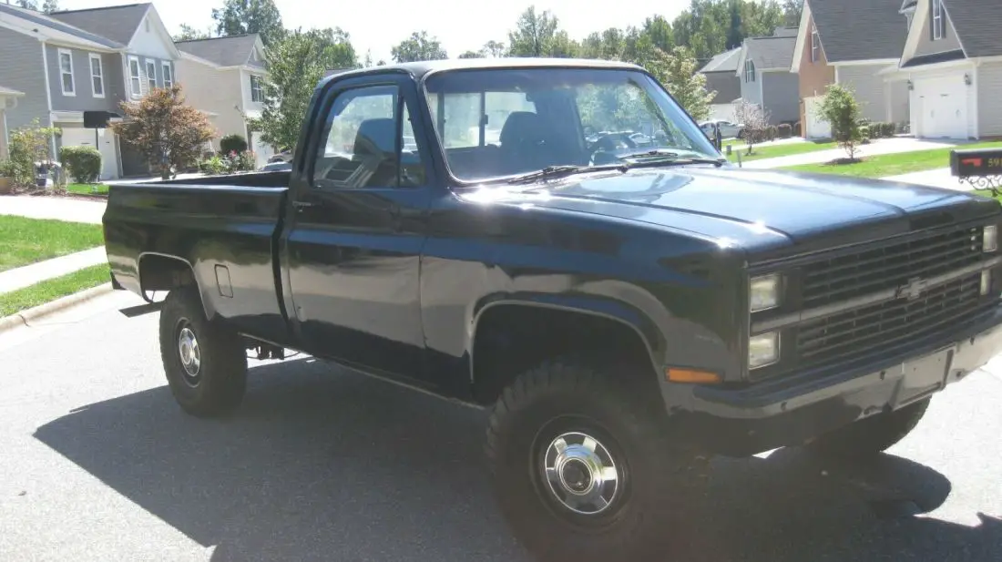 1983 Chevy 3/4 ton long bed 4x4, the truck is a 4 speed with thegranny gear. . carpet with leather interior / black on black.