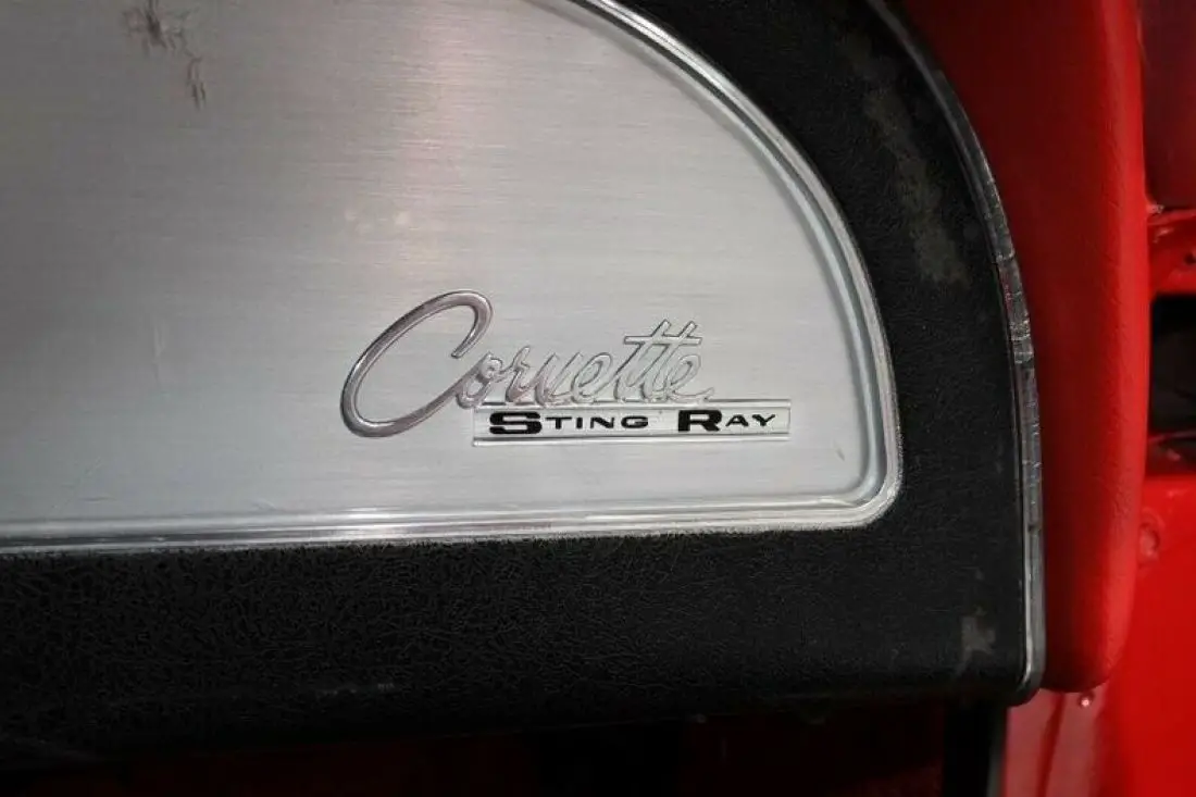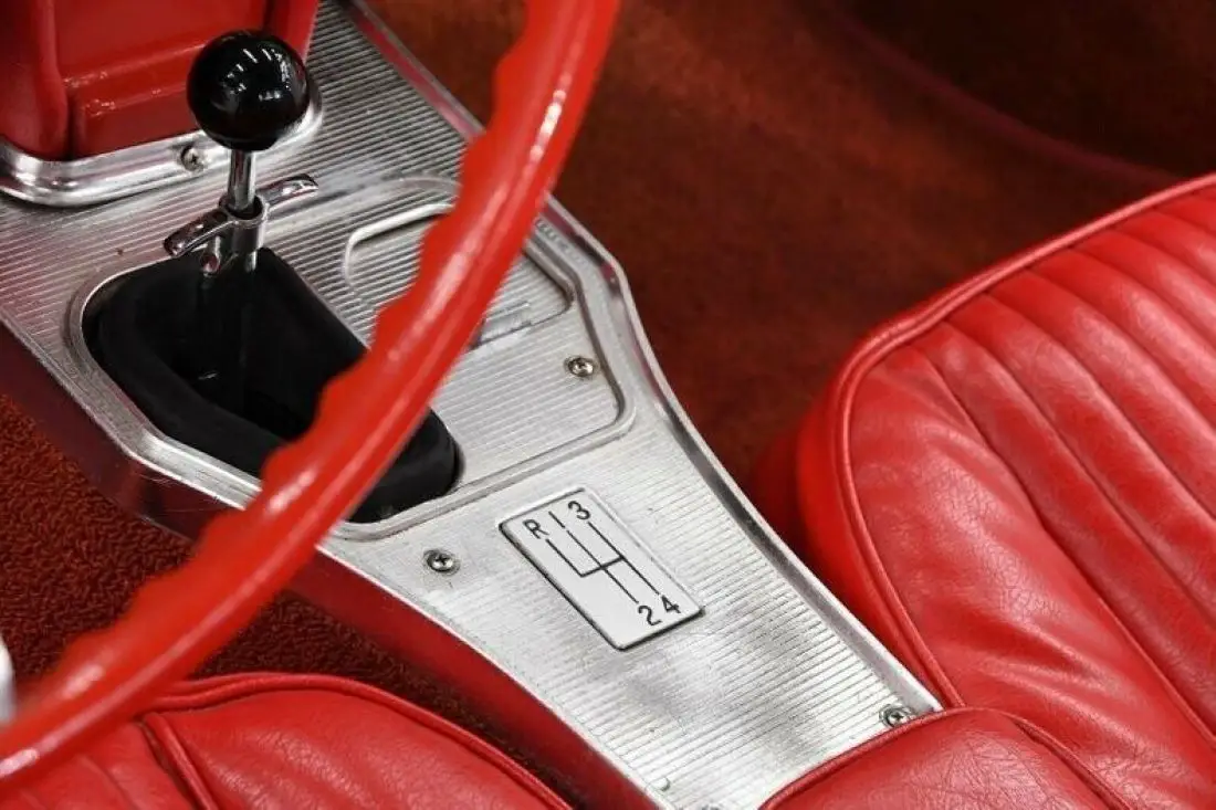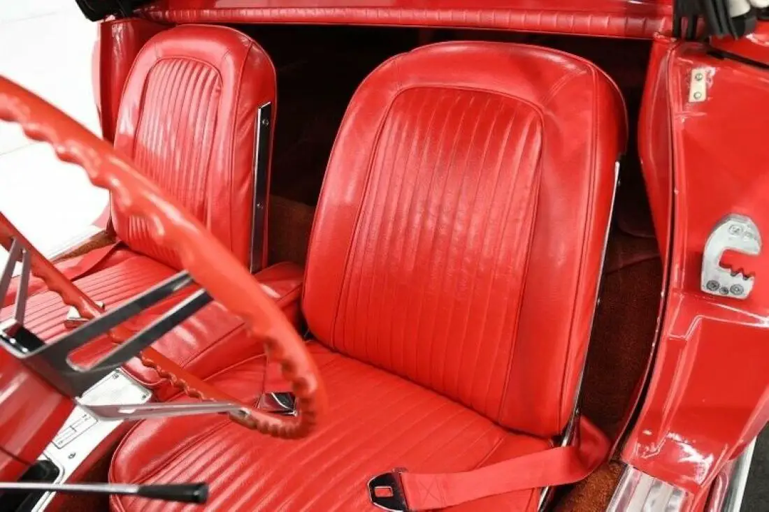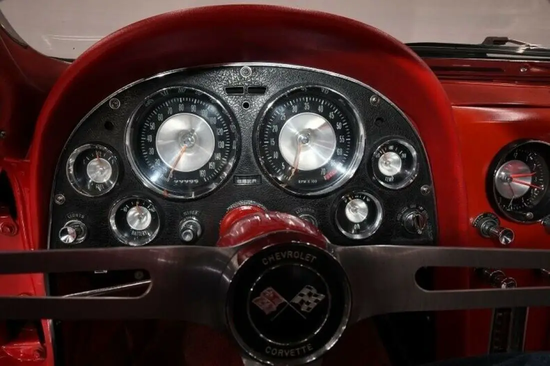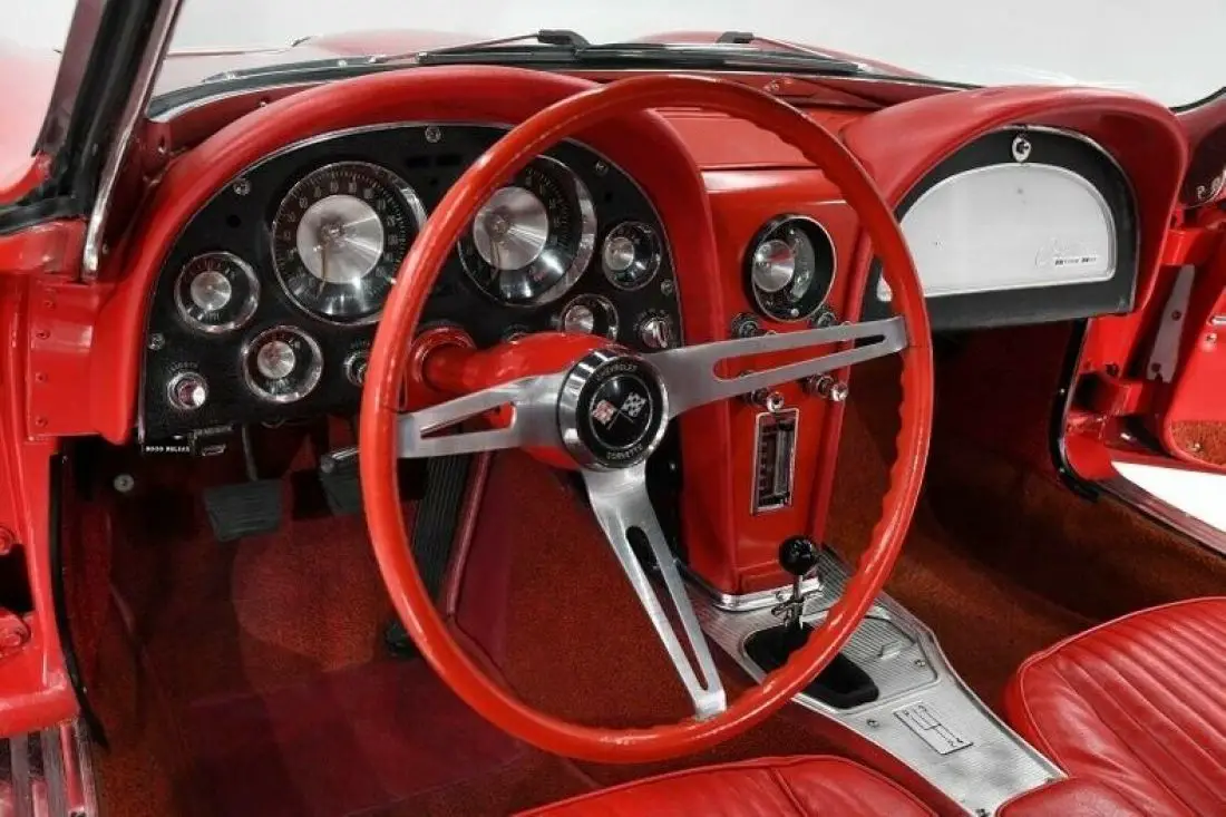 INTERIOR: This is a factory red interior car. The dash pads are real nice, all the factory gauges look real good. It has the original 63 gauges with the cones in the center. The clock his quartz movement, the tachometer is a 6,500 redline which is correct for a 340 hp. It does have an aftermarket retro stereo in the factory location. The centre console looks original, it has some wear. It has correct shifter with reverse lock out. The seats have been reupholstered, has red seat belts. The red carpet is in good shape but it is a little discolored. The door panels