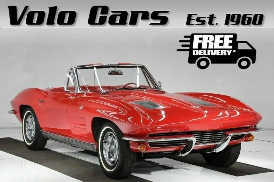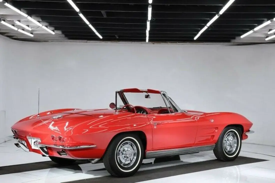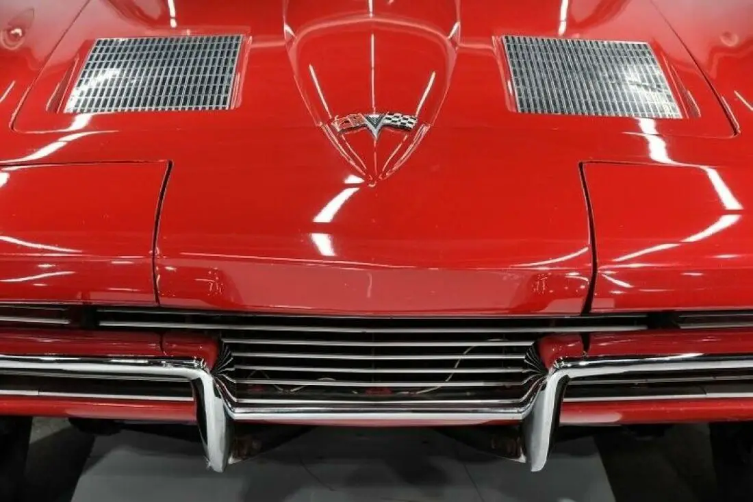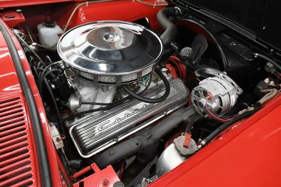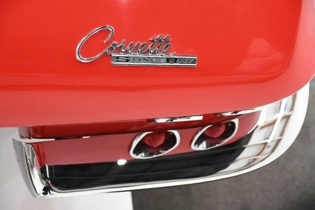 INTERIOR: This is a factory red interior car. The dash pads are real nice, all the factory gauges look real good. It has the original 63 gauges with the cones in the center. The clock his quartz movement, the tachometer is a 6,500 redline which is correct for a 340 hp. It does have an aftermarket retro stereo in the factory location. The centre console looks original, it has some wear. It has correct shifter with reverse lock out. The seats have been reupholstered, has red seat belts. The red carpet is in good shape but it is a little discolored. The door panels