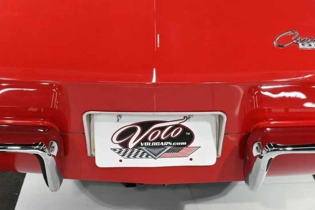 EXTERIOR: Factory Riverside red. The body shows real well, no damage. The paint is very glossy. There are a number of minor imperfections if you look for them. All the chrome and trim shows very well too. Bumpers, taillights, gas lid, emblems, correct antenna look new. The white convertible top is in very good shape. Headlights do open and close properly. The correct spinner hubcaps are in very nice shape.