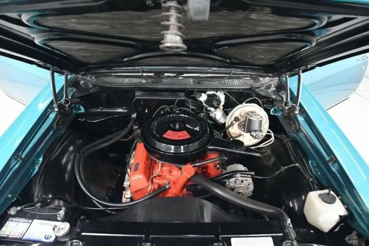 EXTERIOR: The body is exceptionally nice. First impression is a great one, this car looks good! The body is laser beam straight, all the panels fit perfectly square and flush. The doors open and close like a new car. It is smooth even along the bottoms. Rare and beautiful factory color- Tripoli Turquoise. The metal flake is laid out evenly and the clear coat is polished like glass. It has a painted on pinstripe and the lowers are painted black. The car presents itself like a show car but there are some touch ups and nicks if you start looking closely. The chrome bumpers, handles, mirror, vent window frames are excellent. The stainless trim is all excellent. The windshield has been replaced. The rest of the glass is clear, windows fit nice. The vinyl top is excellent. The door jambs are very clean, weather strips are new. It is dressed up with a set of new 15 inch Cragar wheels and BFGoodrich tires.