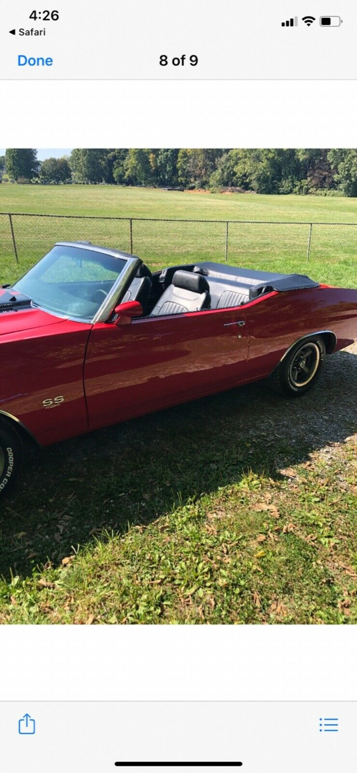 Chevrolet Chevelle 1972 convertible cranberry red, This car is in Mint condition it has a 512 block that runs on pump gas all pistons were changed the trans is a M21, 4 speed rear is a 12 V Posey with 273 gears new custom drive shaft, Front brake drums were changed to disk brakes and new springs, paint is a base coat with a clear coat it has the bucket seats with all new material inside It has a new F40 suspension with a new gas tan, new fuel lines and brake lines, New custom 3 inch exhaust with a flow master!! This Chevelle has it all the looks and the muscl, any questions call or text Bill at 304-820-9649