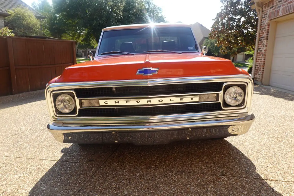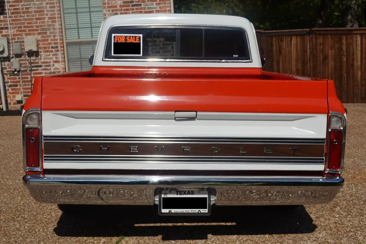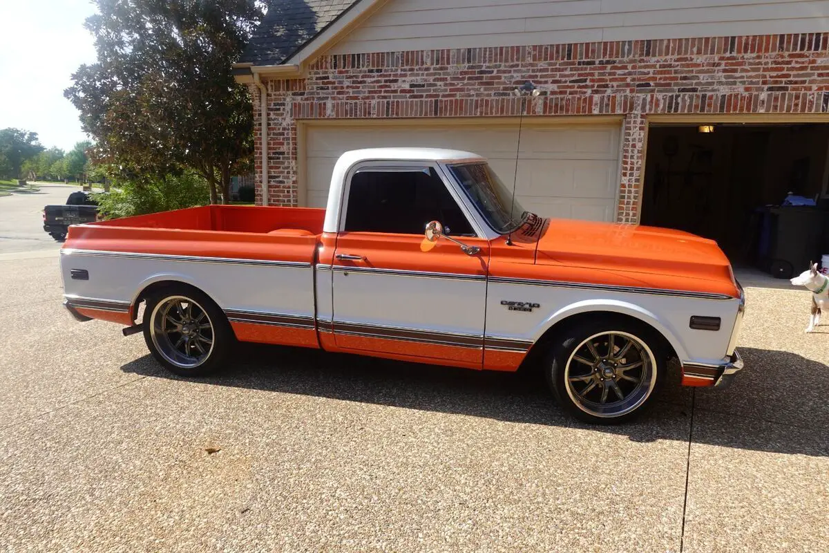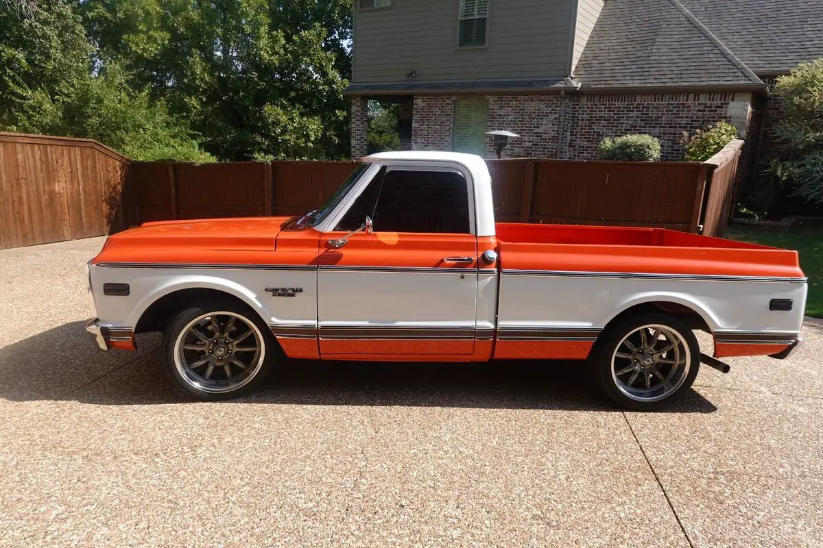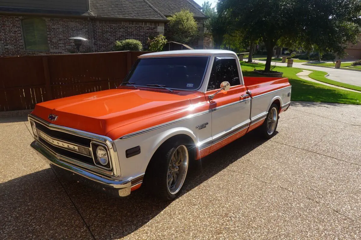 This 1968 Chevrolet C10 is a regular-cab short-bed pickupfinished in orange and white over black upholstery and powered by a replacementBluePrint 383ci V8, with less than 1000mi, paired with a beefed up three-speedautomatic transmission with stall converter. Features include power steering,power front disc brakes, 20″ Ridler wheels, electronic ignition, a dual exhaustsystem, tinted windows, bolstered bucket seats, Polk Audio speakers, and a SonyAM/FM/cassette stereo. The previous owner replaced the bed floor and innerwheel wells. This C10 is offered with a Texastitle in my name.