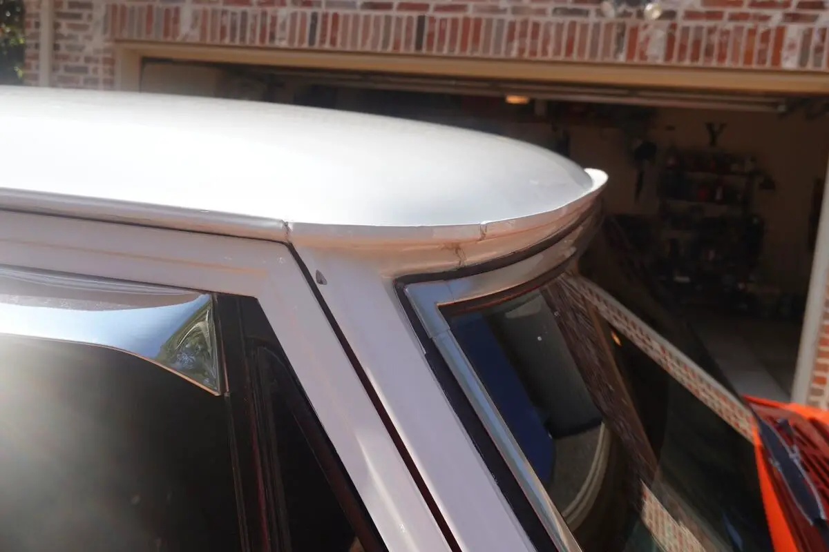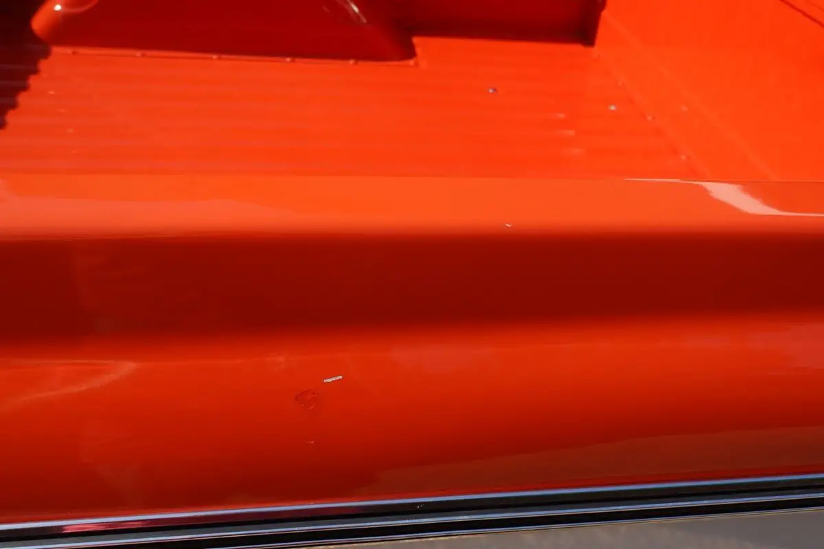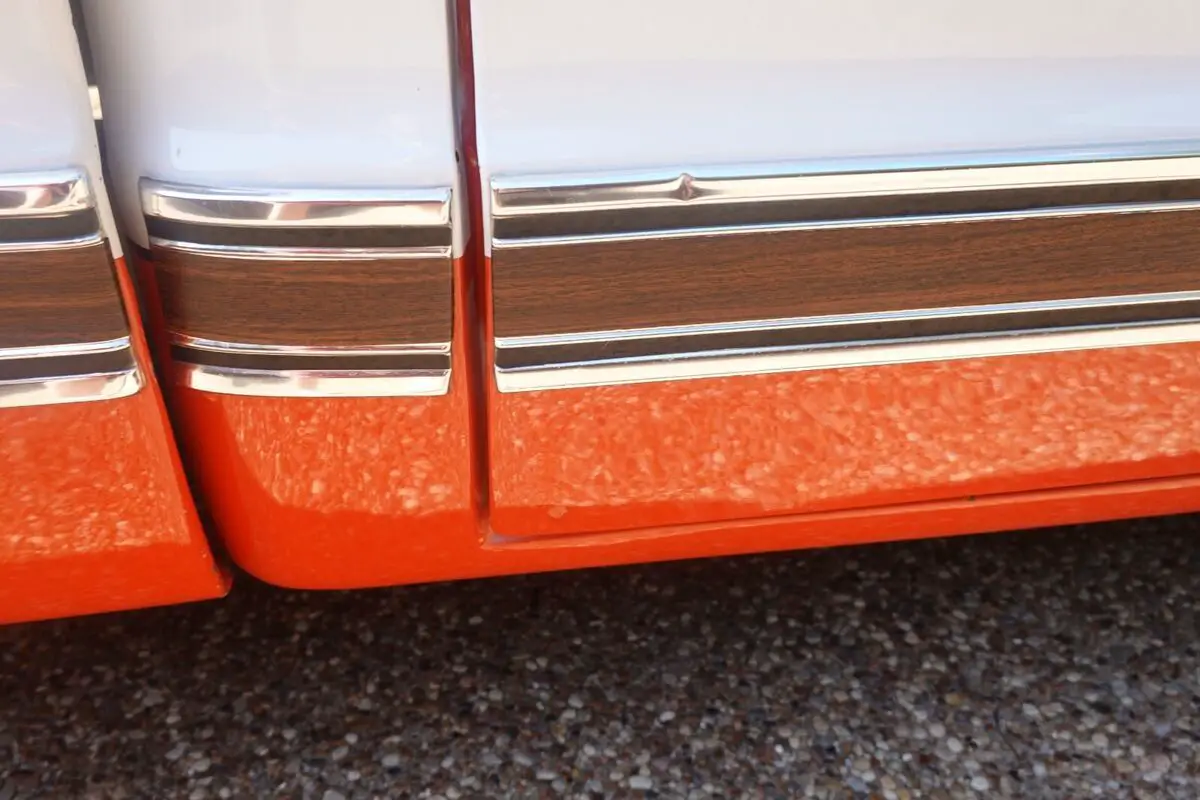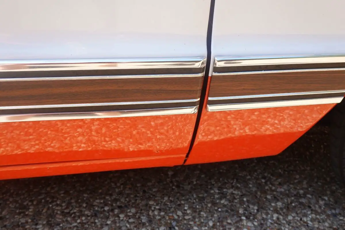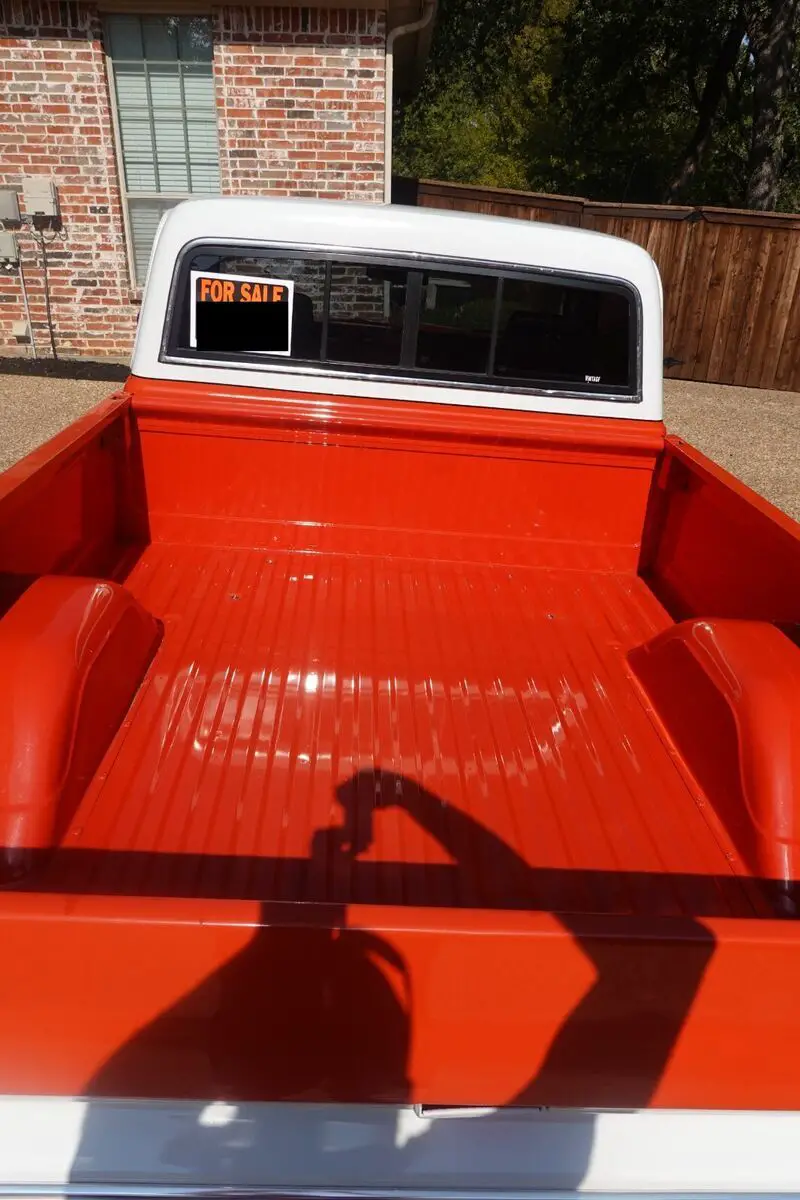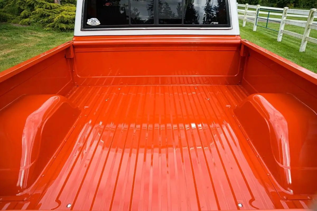 Thetruck was refinished in its current two-tone scheme of orange and white duringprevious ownership. Features include a sliding rear window, dual mirrors,chrome bumpers, body-side faux woodgrain moldings, side window shades, tintedwindows, and a dual-outlet exhaust that exits behind the rear wheels. The bedhas paint chips that have been touched up.