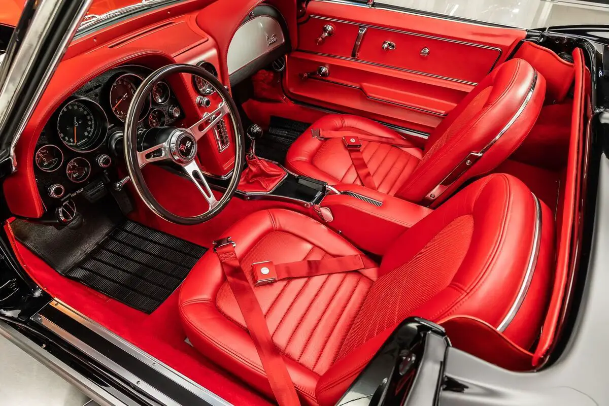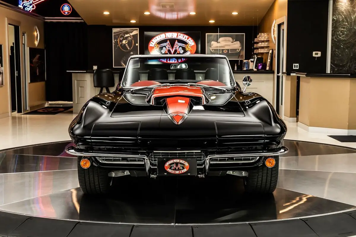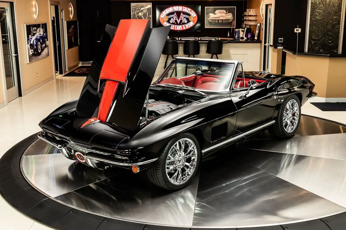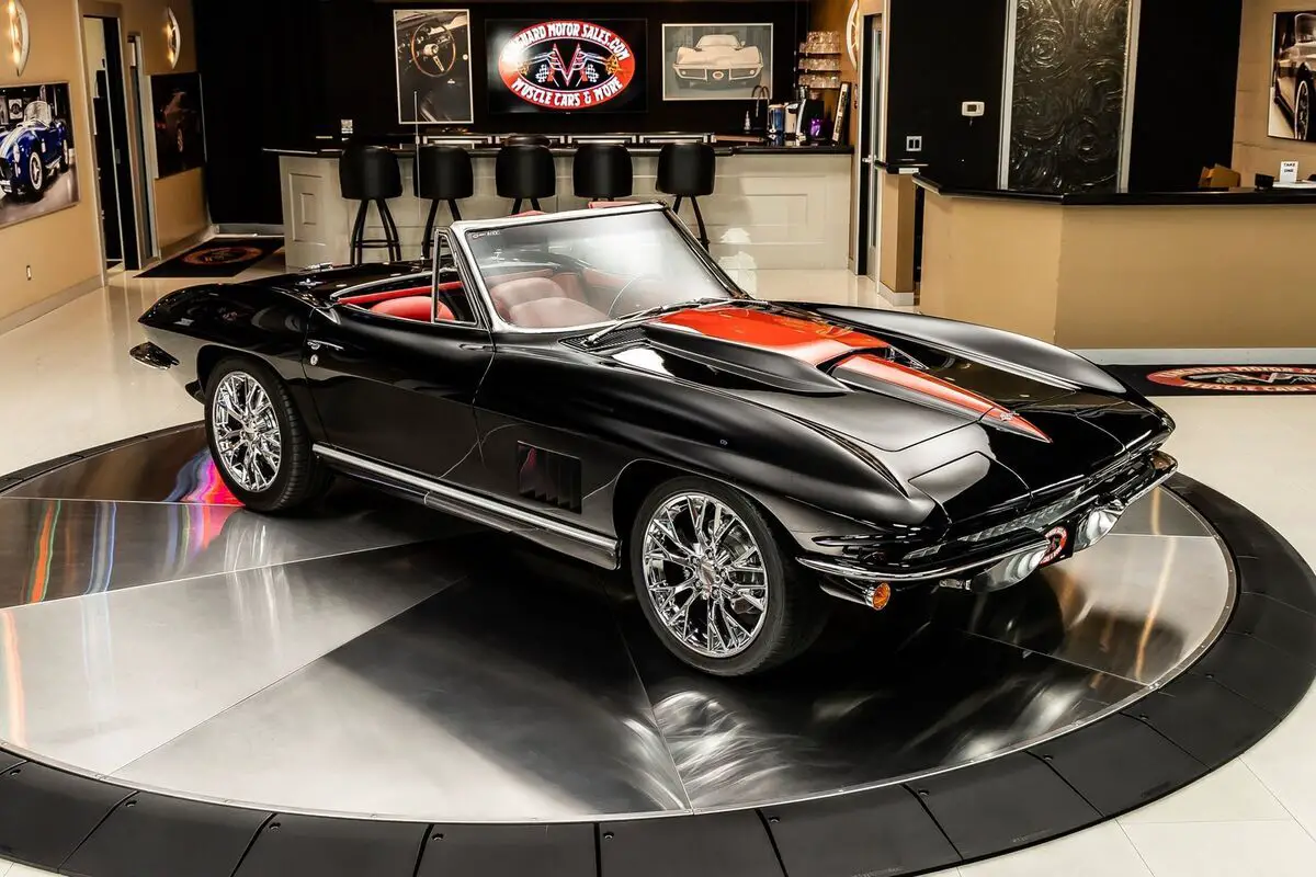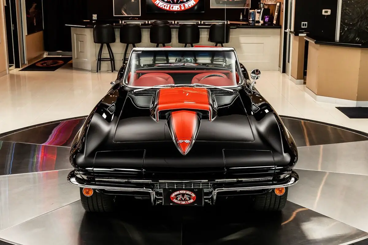 Check out this absolutely incredible 1967 Chevrolet Corvette Convertible Restomod! This second - generation Corvette has undergone a complete two - year long Frame - Off restoration! During the meticulous build, lots of high - performance upgrades were added to this Chevy! Take a look at this Chevy's sweeping body lines, Black Exterior paint with the Red Stinger Hood, Chrome Bumpers, and Polished Trim. Inside, this Corvette beautifully complementing the Red Stinger hood is the red, French - stitched, premium leather interior, Red Carpeting and black Floor Mats, 3-Spoke Steering Wheel, Center Console, along with some storage space in the rear cargo area.