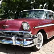 Beautifully Restored 1956 Chevrolet Bel Air 265 V8 Engine Powerglide Automatic Transmission Dusk Plum overIndia IvoryExterior Charcoal & Ivory Interior Stunning Bright Work Power Steering Dual Exhaust Optional Padded Dash Wonderbar Radio &