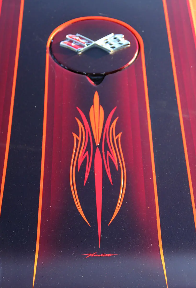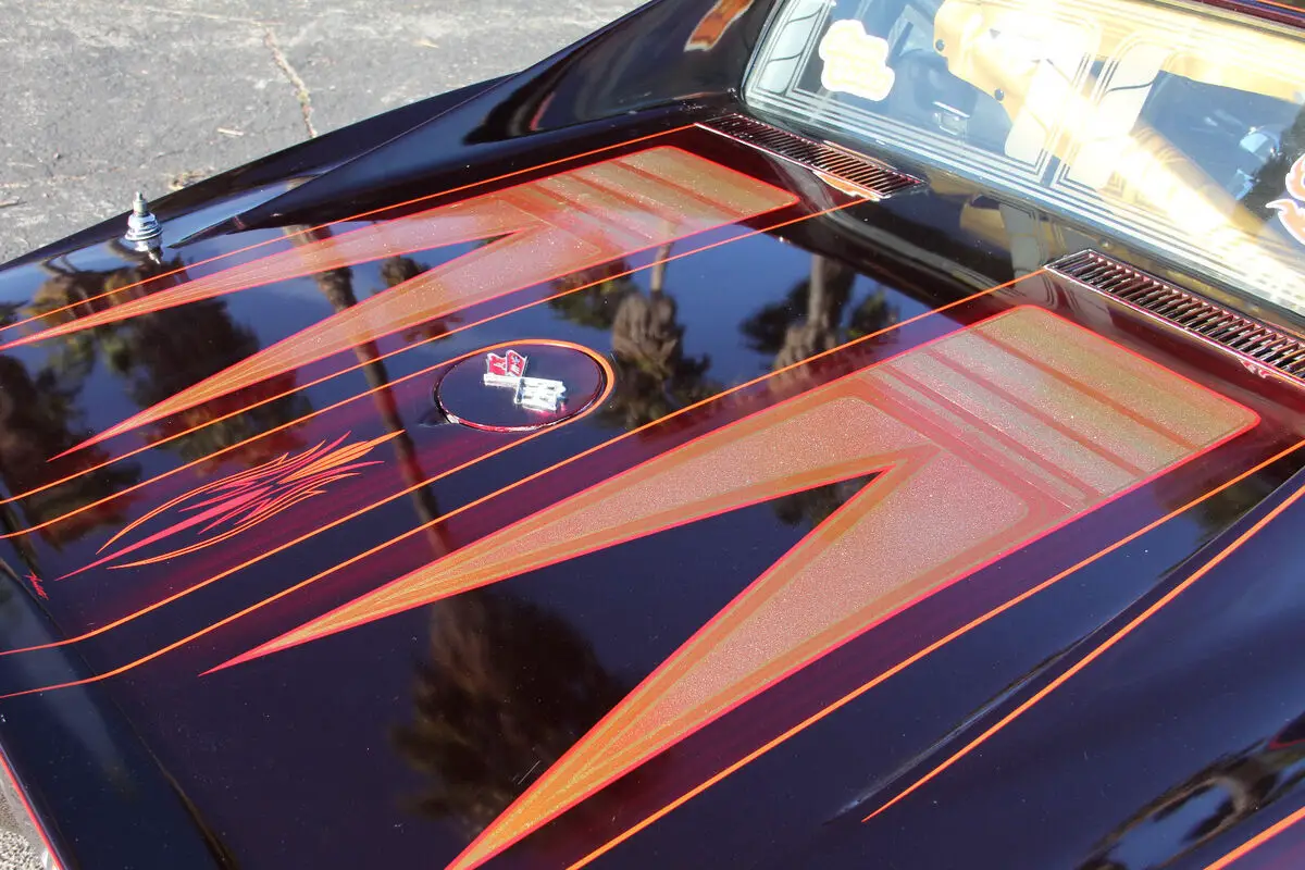 To be clear, the paint on this car is original, old, and has a lot of flaws, when you look at it up close. There are some photos of some of the more obvious problem areas. When I first picked up this car from a buyer in New York, I was going to turn it into a resto-mod, and just wanted a solid base. But when I saw how cool the paint was, I just could not bring myself to grind it all away. So I decided to amplify the 70's look, and added the gold sparkle steering wheel, interior, pinstripes, and other 70's elements.