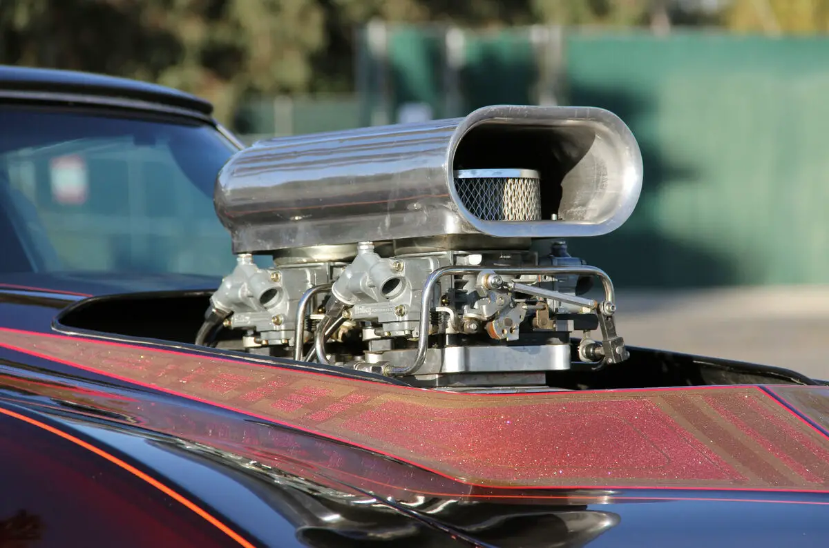 The engine is a Chevy 400, with a Dyers 6V-71 roots supercharger installed. It is not a numbers matching engine. 8.5:1 CR. It is backed up by a Muncie 4 speed transmission. It has a 3:70 rear end. It also has a heavy duty rear spring, offset trailing arms, sway bars, aftermarket shocks, stainless steel calipers, and a Griffin aluminum racing radiator. Dual electric fans. No power steering, no power brakes and no A/C. The supercharger is topped by two new boost-referenced Holley 650CFM dual quad carbs. Ignition is handled by a MSD 6A, as well as a MSD boost timing master, that reduces timing per pound of boost. The boost retard controller is under the dash, as well as a boost gauge on the steering column. It is making around 10 pounds of boost. It is supported by dual fuel pumps, dual fuel filters, dual pressure regulators, and separate fuel lines from the tank to each carb.