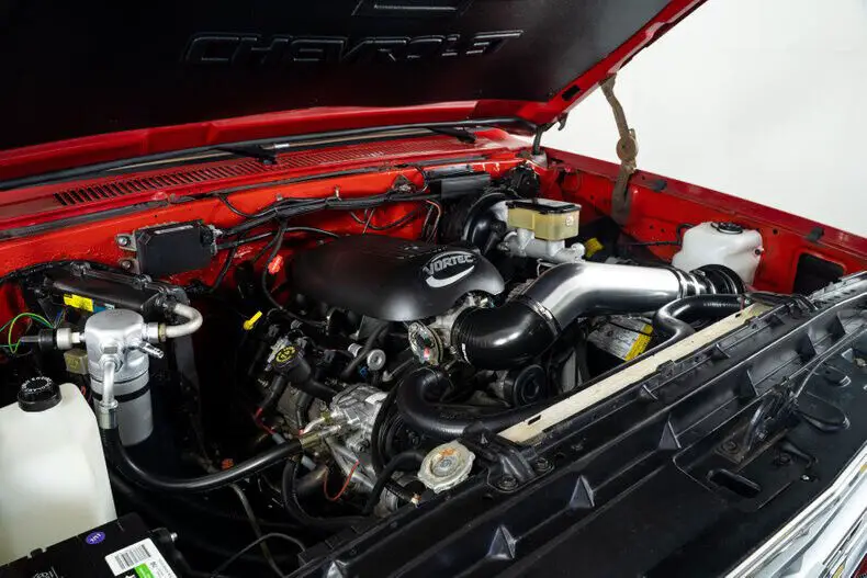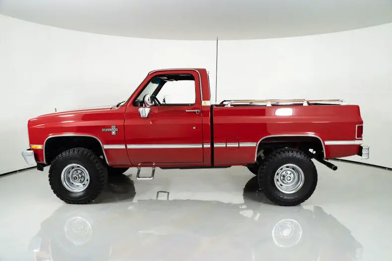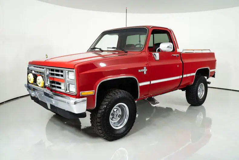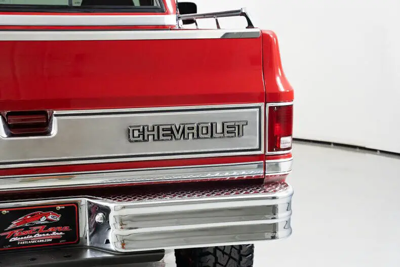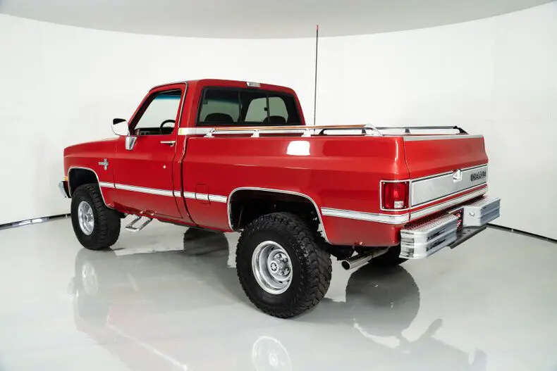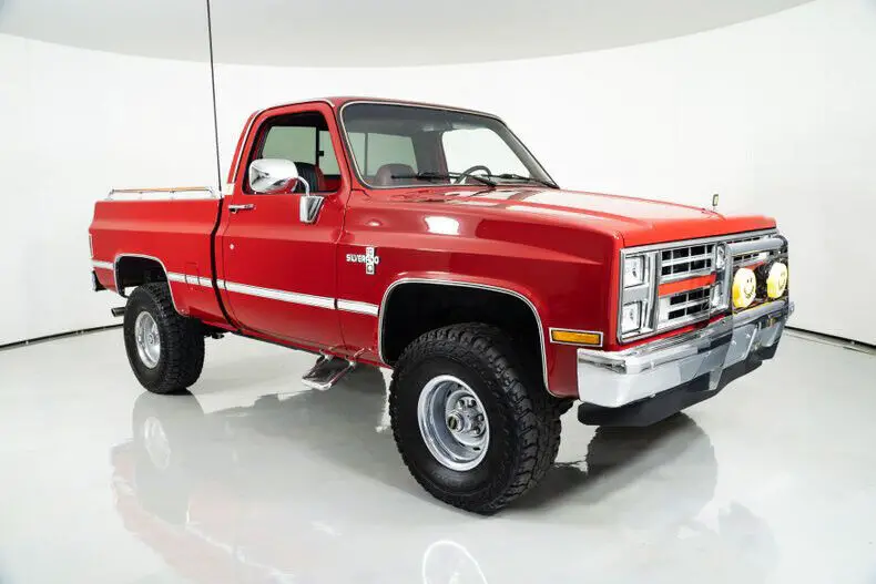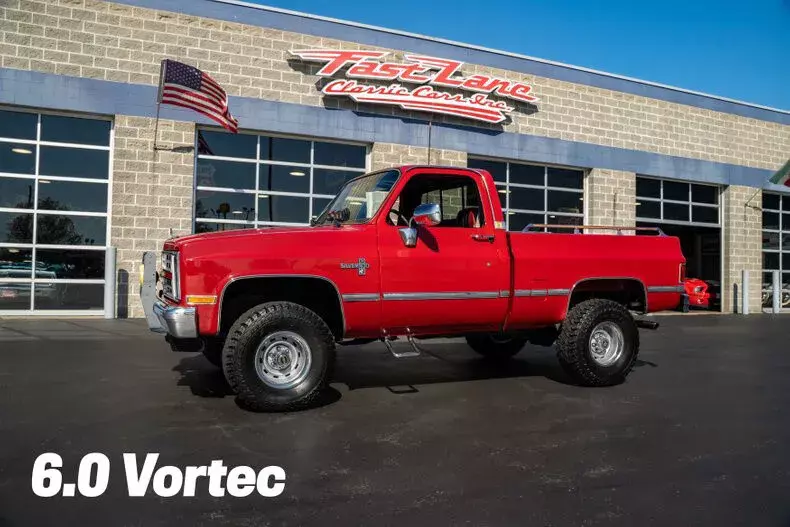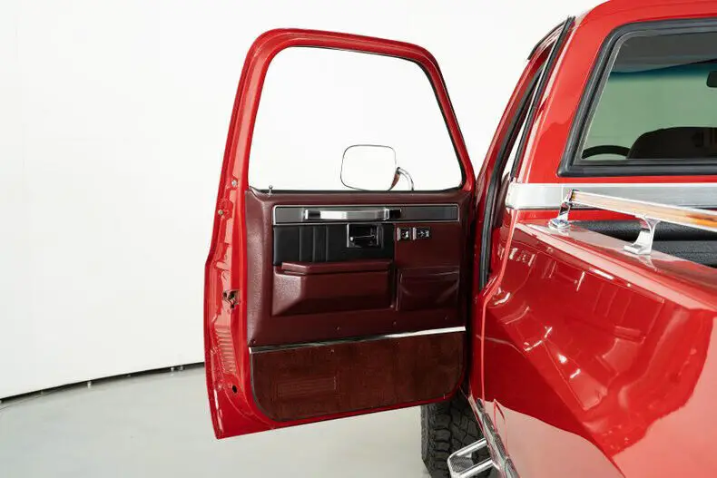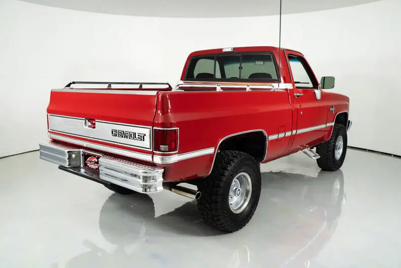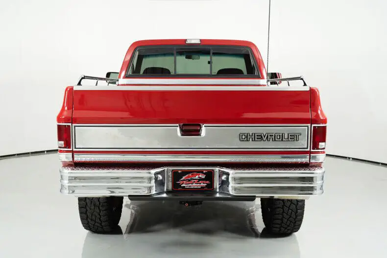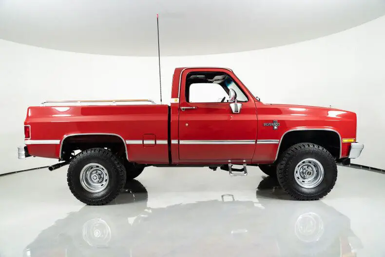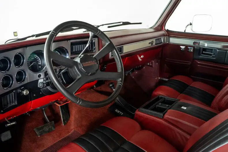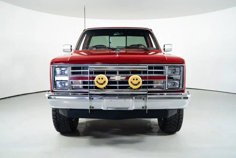 This 1987 Chevrolet K10 4x4 for sale has a Fuel Injected 6.0 Liter Vortec V8, 4L80E 4 Speed Automatic Transmission, Bright Red Exterior, Red/Black Two Tone Custom Interior, Red Rally Wheels with All Terrain Tires, Chrome Bull Bar with KC Daylighter Off Road Lights, Custom Heated Leather Seats, Custom Headliner with Built in Speakers and CB Radio, Premium Sound System with Subwoofer, Cruise Control, Air Conditioning, Dakota Digital Gauges, Bed Liner, Dual Exhaust, Side Steps, Bed Rails, A Classic Chevy 4x4 with the Comfort of a New Truck!