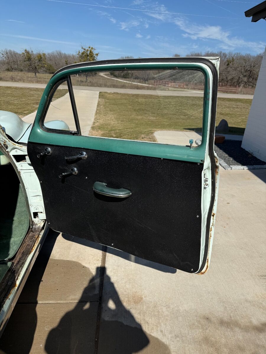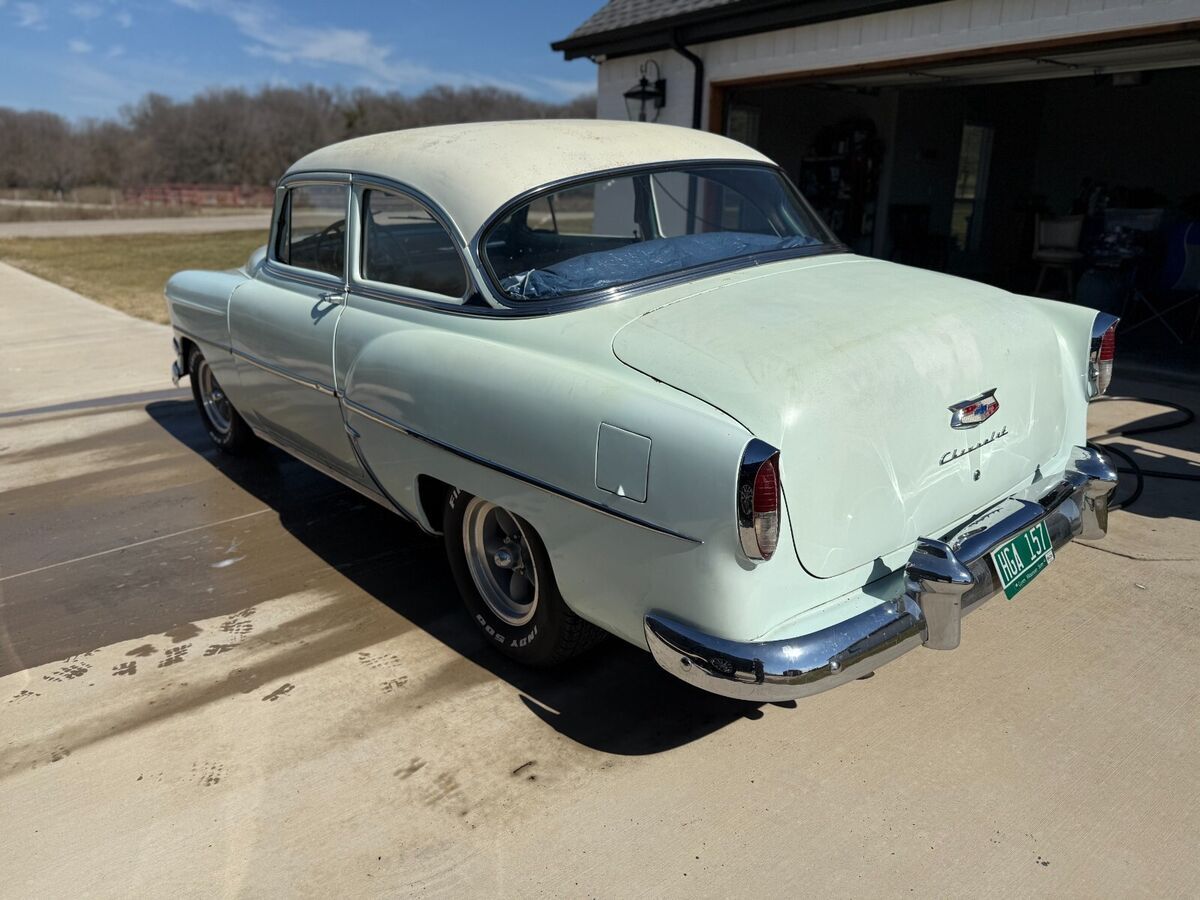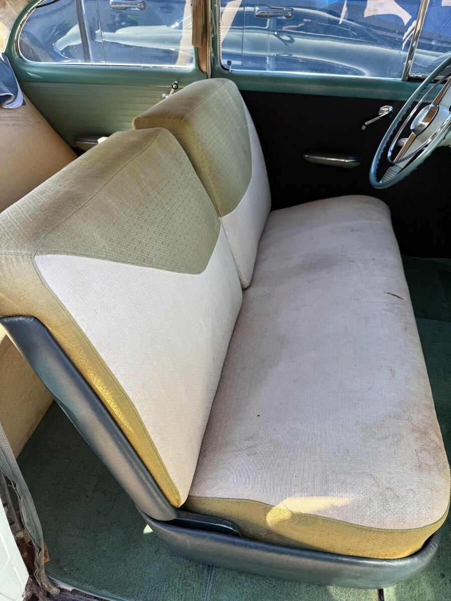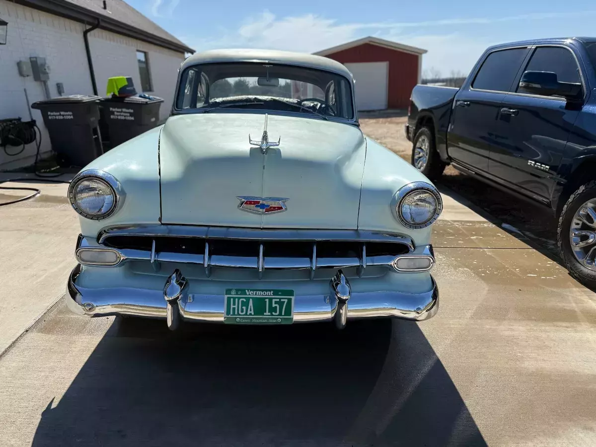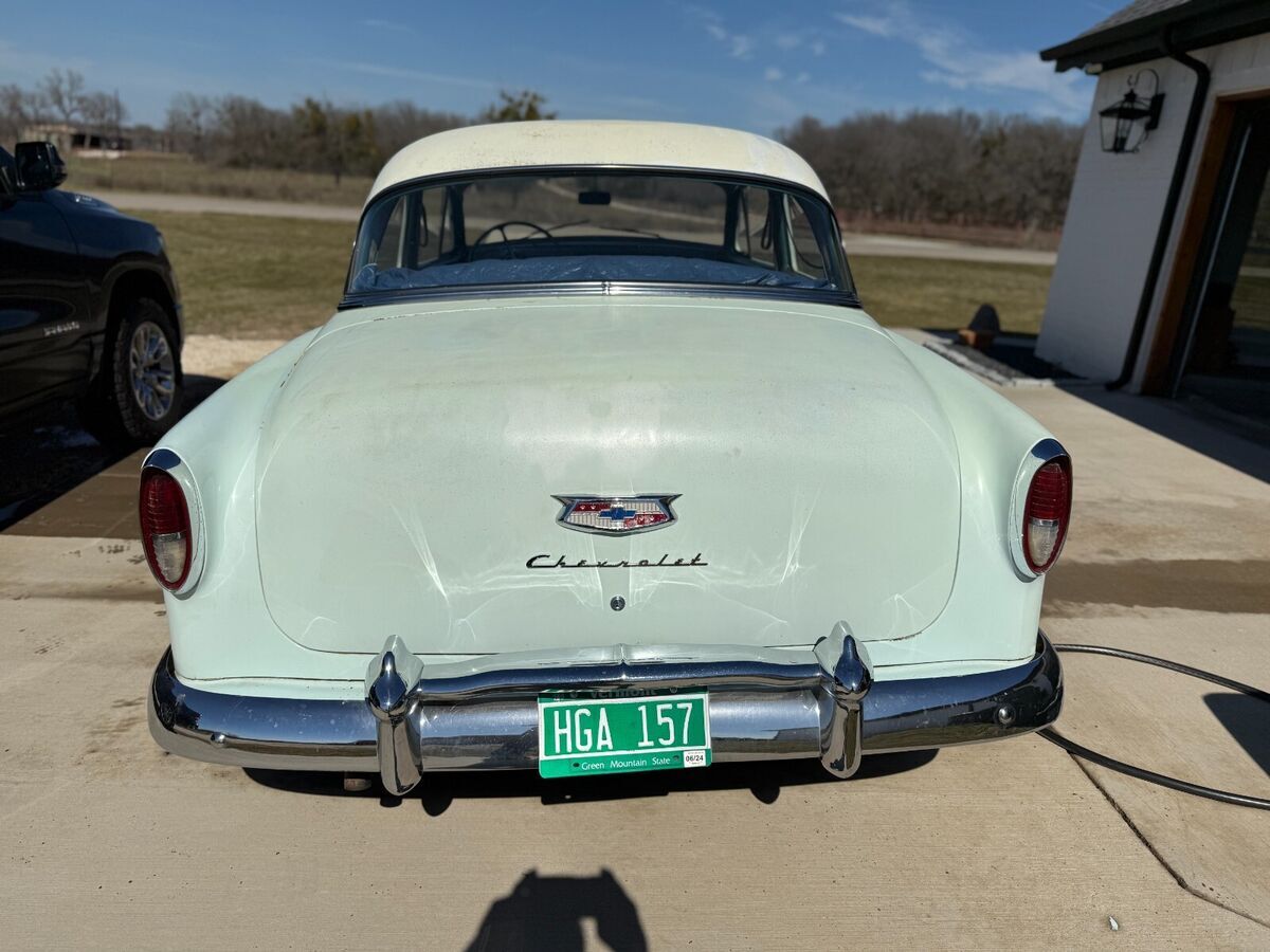 This is a classic Chevrolet 210 sedan with a green exterior and interior. It has a manual transmission, a 6-cylinder 235 cu in engine running on gasoline. This vintage car has 2 doors and a clean vehicle title. Has 5 additional tires, rims and Chevy hub caps. Includes jack.