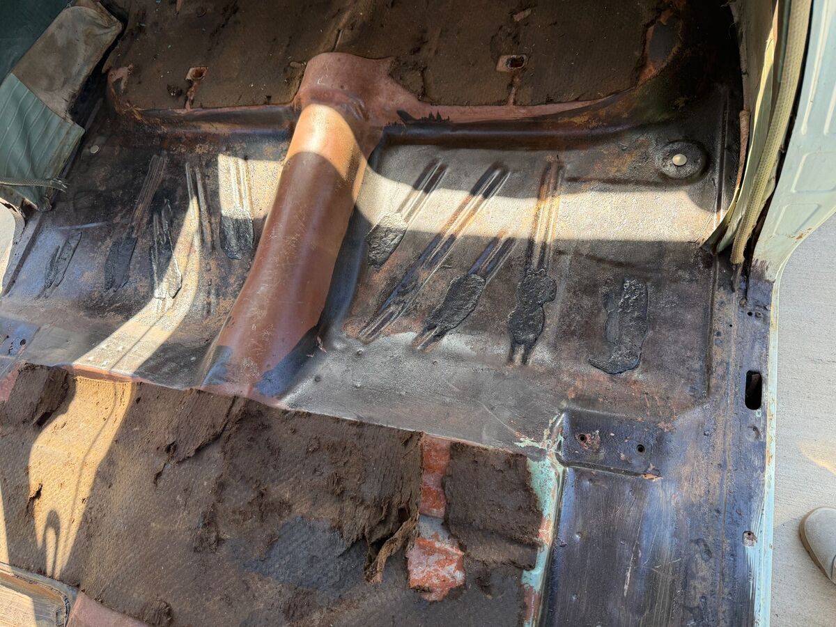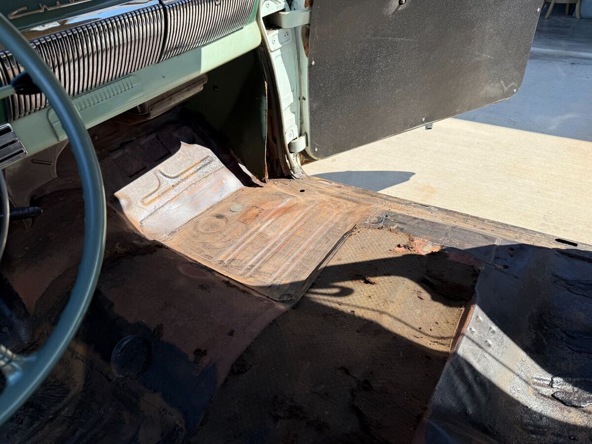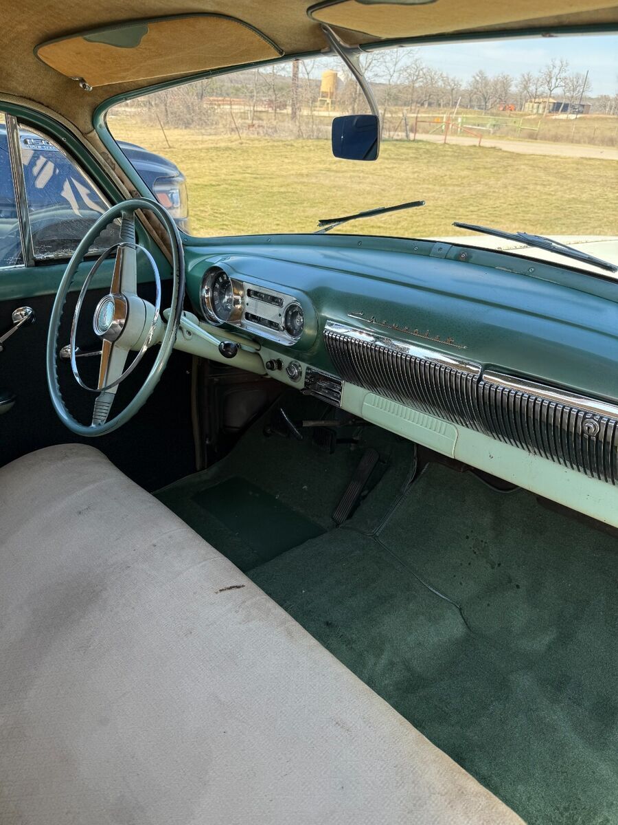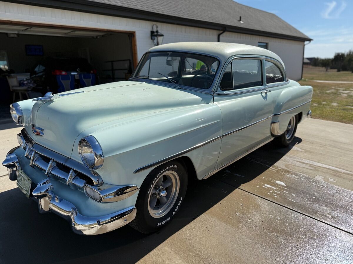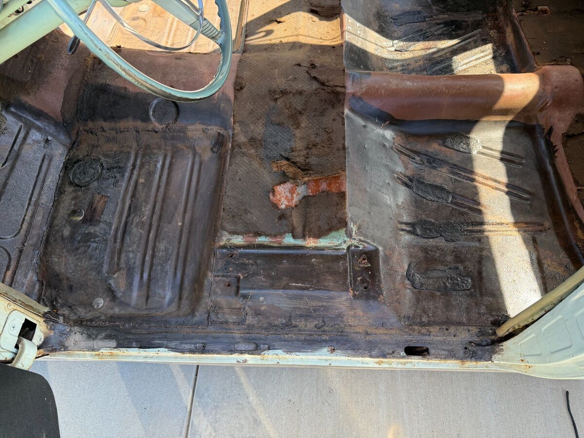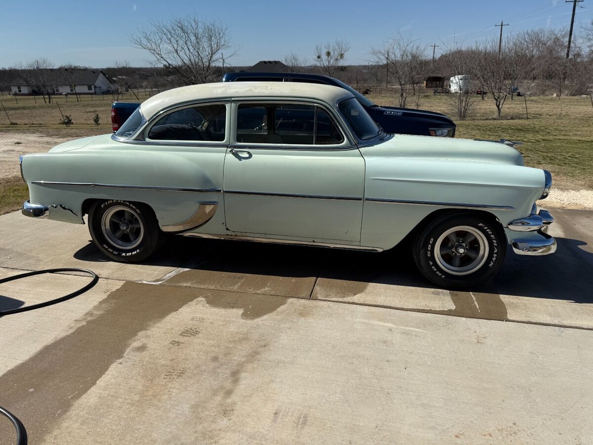 This is a classic Chevrolet 210 sedan with a green exterior and interior. It has a manual transmission, a 6-cylinder 235 cu in engine running on gasoline. This vintage car has 2 doors and a clean vehicle title. Has 5 additional tires, rims and Chevy hub caps. Includes jack.
